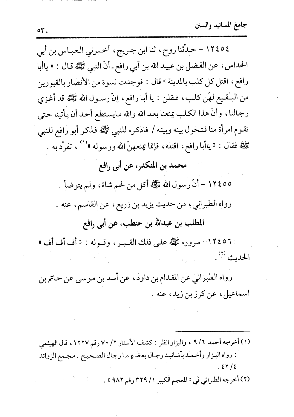 12454 - حدثنا روح، ثنا ابن جريج، أخبرنى العباس بن أبى الحداس، عن الفضل بن عبيد الله بن أبى رافع ـ أن النبى - صلى الله عليه وسلم - قال: «يا أبا رافع، اقتل كل كلب بالمدينة» قال: فوجدت نسوة من الأنصار بالقبورين من البقيع لهن كلب، فقلن: يا أبا رافع، إن رسول الله - صلى الله عليه وسلم - قد أغزى رجالنا، وأن هذا الكلب يمنعنا بعد الله والله ما يستطع أحد أن يأتينا حتى تقوم امرأة منا فتحول بينه وبينه/ فاذكره للنبى - صلى الله عليه وسلم - فذكر أبو رافع للنبى - صلى الله عليه وسلم - فقال: «يا أبا رافع، أقتله، فإنما يمنعهن الله ورسوله» (¬1) . تفرد به.