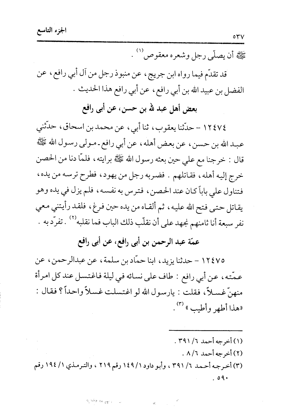 12475 - حدثنا يزيد، ابنا حماد بن سلمة، عن عبد الرحمن، عن عمته، عن ابى رافع: طاف على نسائه فى ليلة فاغتسل عند كل امرأة منهن غسلاً، فقلت: يا رسول الله لو اغتسلت غسلاً واحدًا؟ فقال: «هذا أطهر وأطيب» (¬2) .