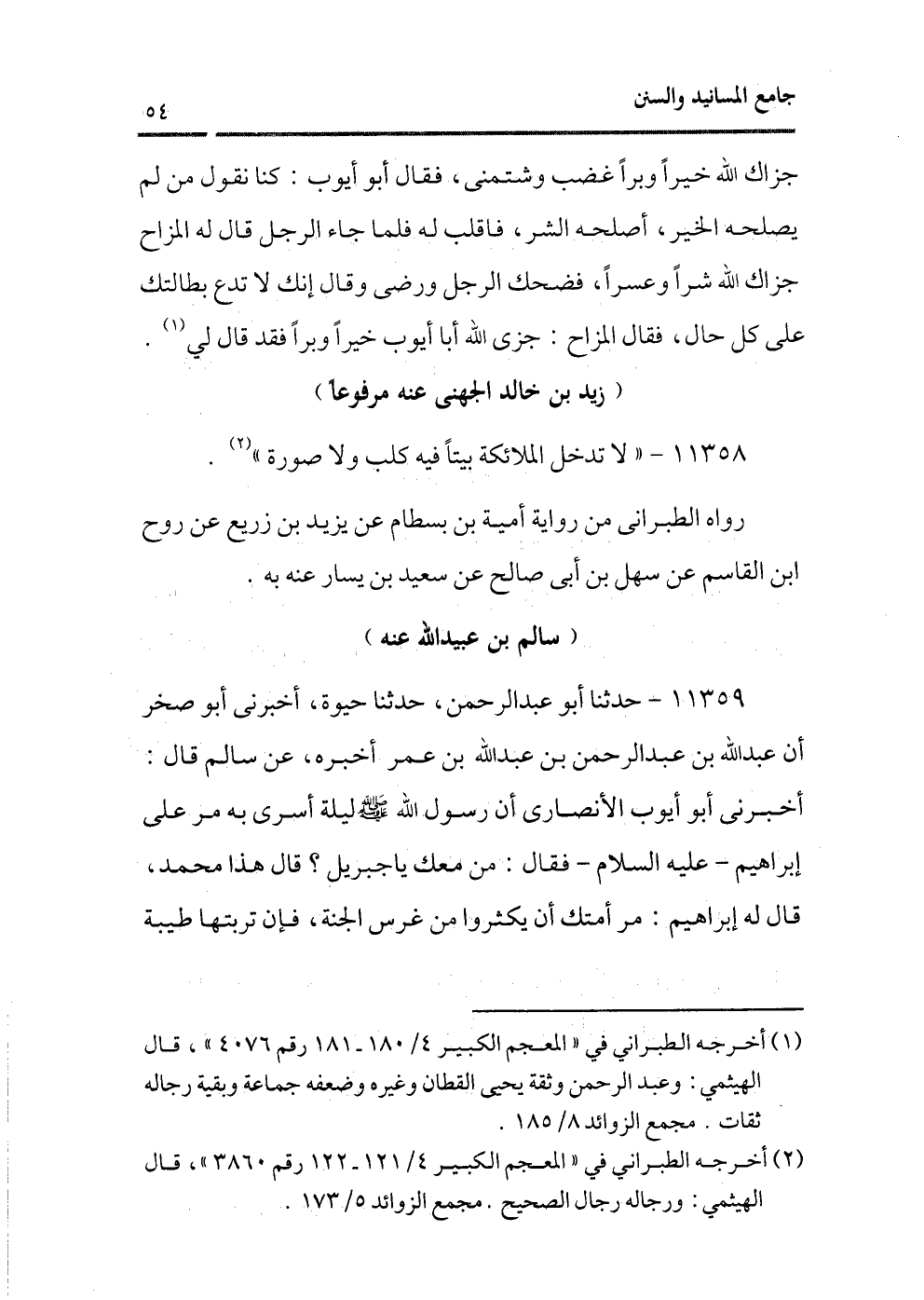 11359 - حدثنا أبو عبد الرحمن، حدثنا حيوة، أخبرنى أبو صخر أن عبد الله بن عبد الرحمن بن عبد الله بن عمر أخبره، عن سالم قال: أخبرنى أبو أيوب الأنصارى أن رسول الله - صلى الله عليه وسلم - ليلة أسرى به مر على إبراهيم ـ عليه السلام ـ فقال: من معك يا جبريل؟ قال هذا محمد، قال له إبراهيم: مر أمتك أن يكثروا من غرس الجنة، فإن تربتها طيبة