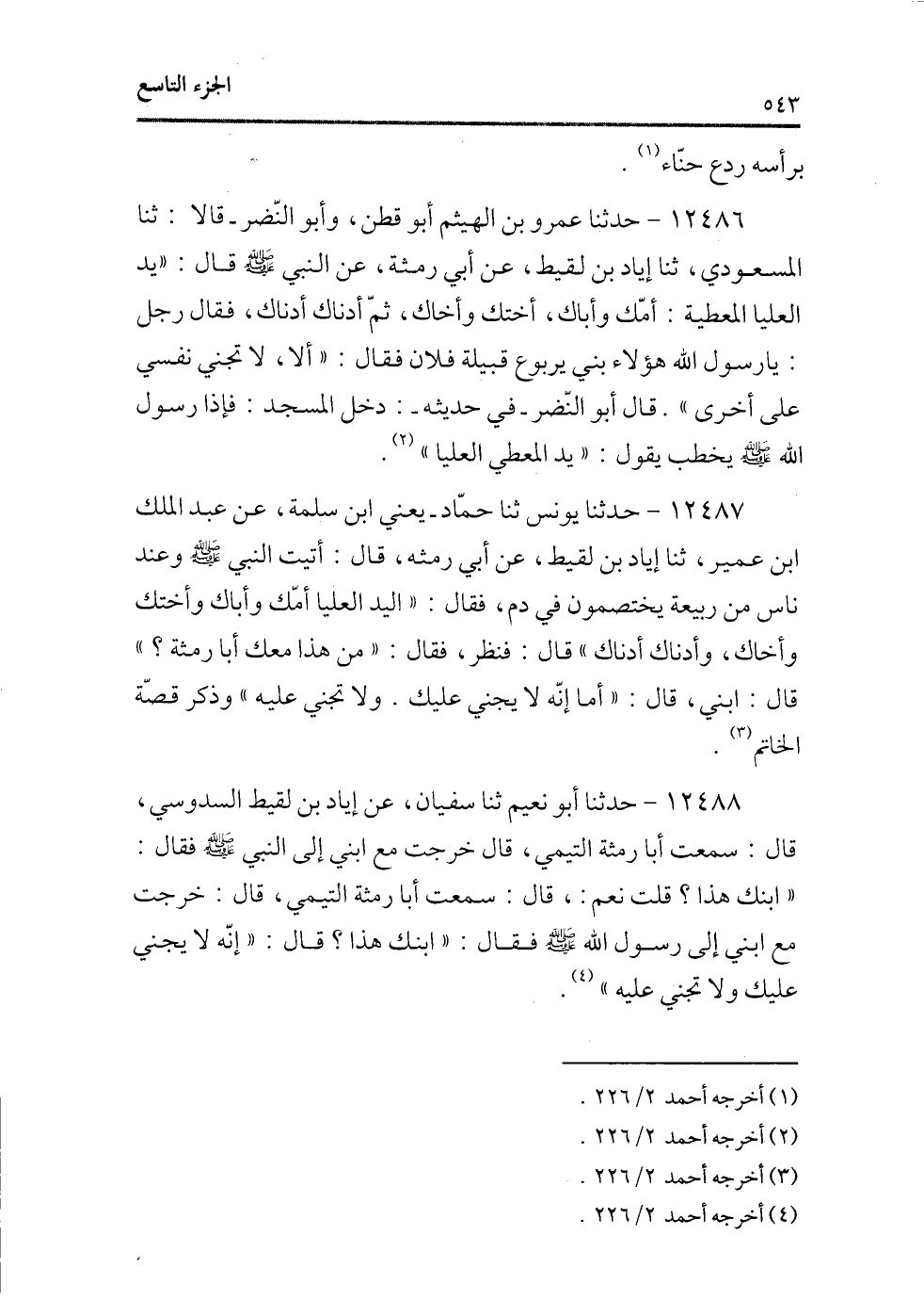 12487 - حدثنا يونس ثنا حماد ـ يعنى ابن سلمة، عن عبد الملك بن عمير، ثنا إياد بن لقيط، عن أبى رمثة، قال: أتيت النبى - صلى الله عليه وسلم - وعند ناس من ربيعة يختصمون فى دم، فقال: «اليد العليا أمك وأباك وأختك وأخاك، وأدناك أدناك» قال: فنظر، فقال: «من هذا معك أبا رمثة؟» قال: ابنى، قال: «أما إنه لا يجنى عليك. ولا تجنى عليه» وذكر قصة الخاتم (¬2) .