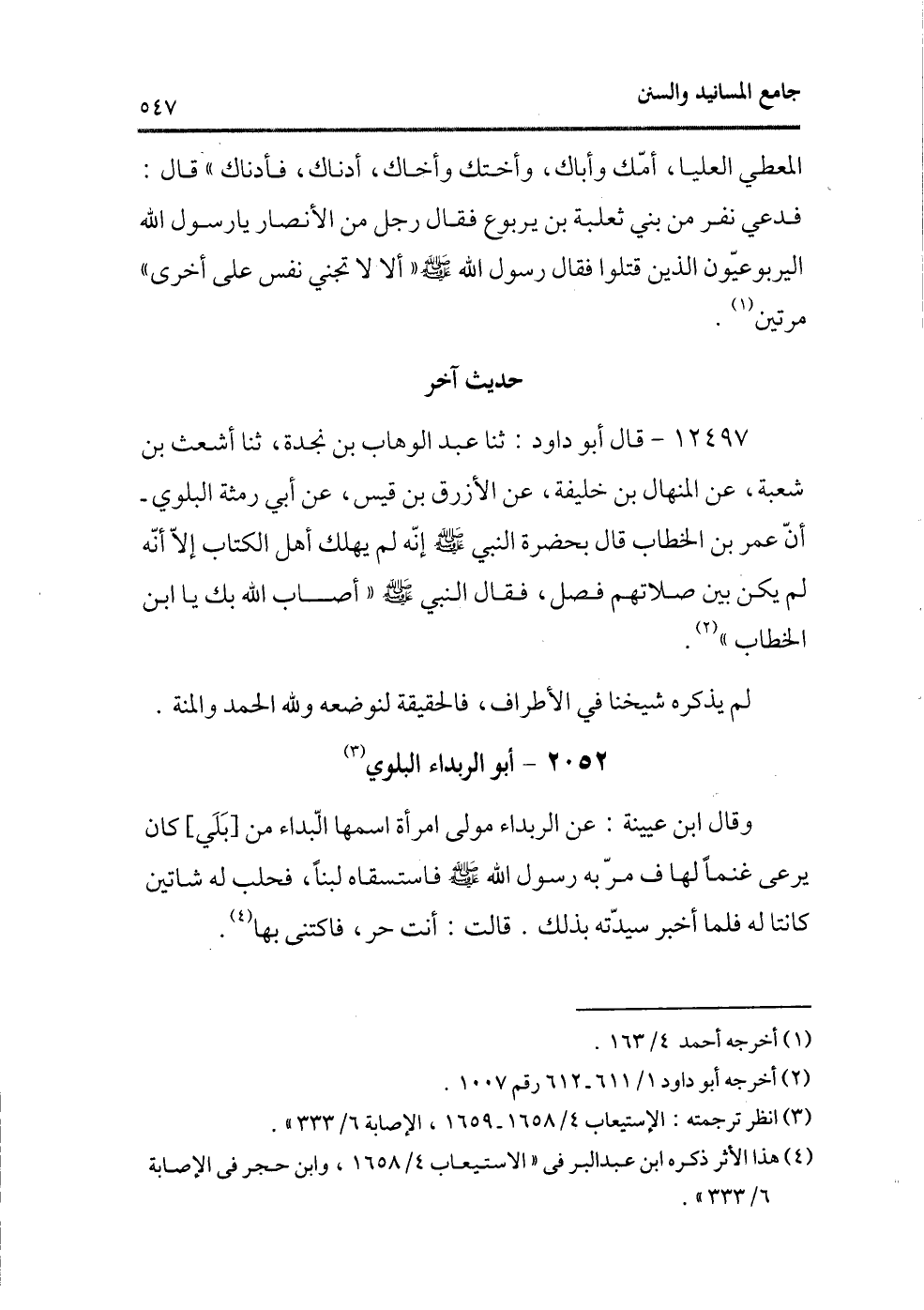 12497 - قال أبو داود: ثنا عبد الوهاب بن نجدة، ثنا أشعث بن شعبة، عن المنهال بن خليفة، عن الأزرق بن قيس، عن أبى رمثة البلوى ـ أن عمر بن الخطاب قال بحضرة النبى - صلى الله عليه وسلم - إنه لم يهلك أهل الكتاب إلا أنه لم يكن بين صلاته فصل، فقال النبى - صلى الله عليه وسلم - «أصاب الله بك يا ابن الخطاب» (¬1) .