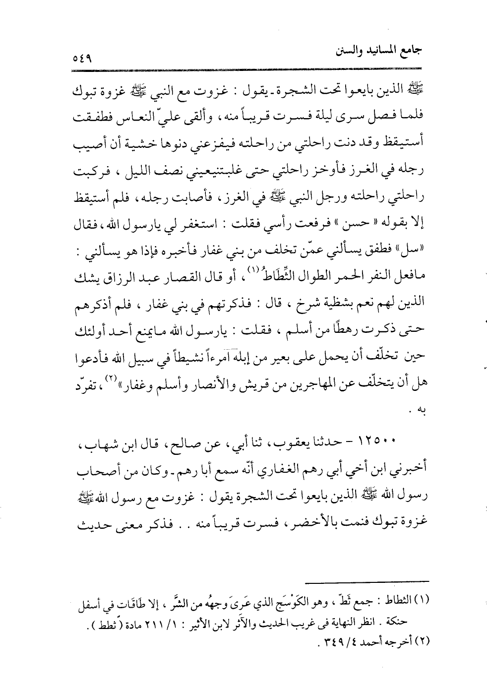 - صلى الله عليه وسلم - الذين بايعوا تحت الشجرة ـ يقول: غزوت مع النبى - صلى الله عليه وسلم - غزوة تبوك فلما فصل سرى ليلة فسرت قريباً منه، وألقى على النعاس فطفقت أستيقظ وقد دنت راحلتى من راحلته فيفزعنى دنوها خشية أن أصيب رجله فى الغرز فأوخز راحلتى حتى غلبتنى عينى نصف الليل، فركبت راحلتى راحلته ورجل النبى - صلى الله عليه وسلم - فى الغرز، فأصابت رجله، فلم أستيقظ إلا بقوله «حسن» فرفعت رأسى فقلت: استغفر لى يا رسول الله، فقال «سل» فطفق يسألنى عمن تخلف من بنى غفار فأخبره فإذا هو يسألنى: ما فعل النفر الحمر الطوال الثطاط (¬1) ، أو قال القصار عبد الرزاق يشك الذين لهم نعم بشظية شرخ، قال: فذكرتهم فى بنى غفار، فم أذكرهم حتى ذكرت رهطاً من أسلم، فقلت: يا رسول الله ما يمنع أحد أولئك حين تخلف أن يحمل على بعير من إبله امرءاً نشيطاً فى سبيل الله فأدعوا هل أن يتخلف عن المهاجرين من قريش والأنصار وأسلم وغفار» (¬2) ، تفرد به.