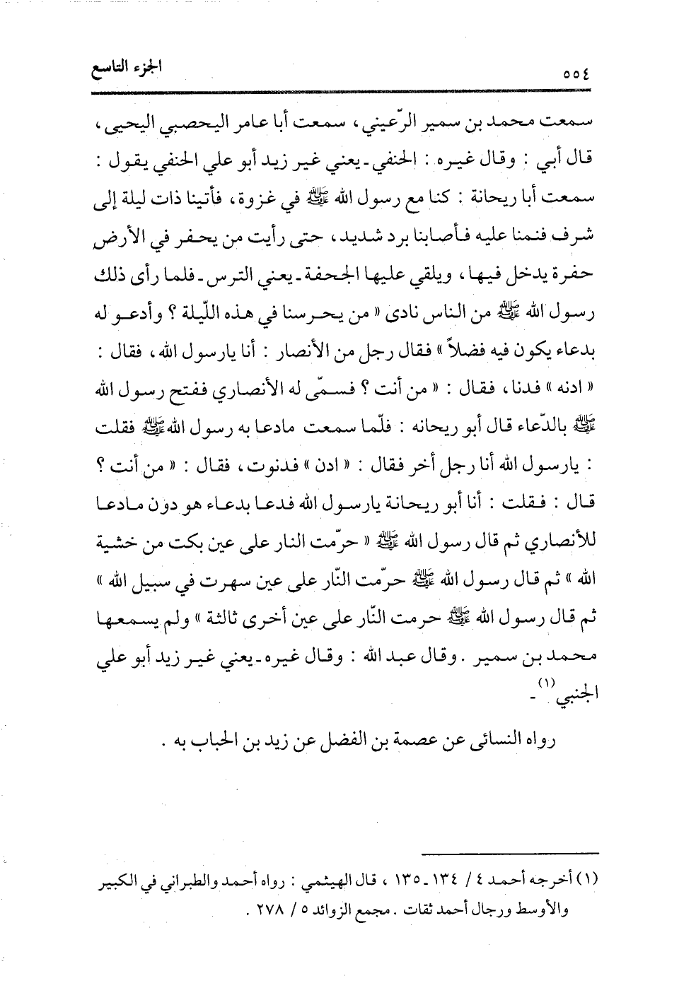 سمعت محمد بن سمير الرعينى، سمعت أبا عامر اليحصبى اليحيى، قال أبى: وقال غيره: الحنفى ـ يعنى غير زيد أبو على الحنفى يقول: سمعت أبا ريحانة: كنا مع رسول الله - صلى الله عليه وسلم - فى غزوة، فأتينا ذات ليلة إلى شرف فنمنا عليه فأصابنا برد شديد، حتى رأيت من يحفر فى الأرض حفرة يدخل فيها، ويلقى عليها لجحفة ـ يعنى الترس ـ فلما رأى ذلك رسول الله - صلى الله عليه وسلم - من الناس نادى «من يحرسنا فى هذه الليلة؟ وأدعو له بدعاء يكون فيه فضلاً» فقال رجل من الأنصار: أنا يا رسول الله، فقال: «ادنه» فدنا، فقال: «من أنت؟ فسمى له الأنصارى ففتح رسول الله - صلى الله عليه وسلم - بالدعاء قال أبو ريحانة: فلما سمعت ما دعا به رسول الله - صلى الله عليه وسلم - فقلت: يا رسول الله أنا رجل أخر فقال: «ادن» فدنوت، فقال: «من أنت؟ قال: فقلت: أنا أبو ريحانة يا رسول الله فدعاء بدعاء هو دون ما دعا للأنصارى ثم قال رسول الله - صلى الله عليه وسلم - «حرمت النار على عين بكت من خشية الله» ثم قال رسول الله - صلى الله عليه وسلم - حرمت النار على عين سهرت فى سبيل الله» ثم قال رسول الله - صلى الله عليه وسلم - حرمت النار على عين أخرى ثالثة» ولم يسمعها محمد بن سمير. وقال عبد الله: وقال غيره ـ يعنى غير زيد أبو على الجنبى (¬1) .