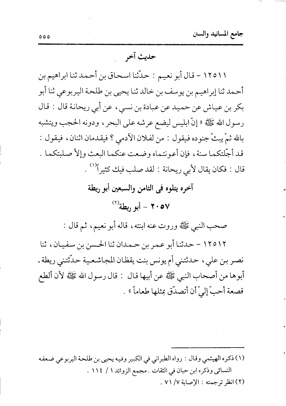 12511 - قال أبو نعيم: حدثنا إسحاق بن أحمد ثنا إبراهيم بن أحمد ثنا إبراهيم بن يوسف بن خالد ثنا يحيى بن طلحة اليربوعى ثنا أبو بكر بن عياش عن حميد عن عبادة بن نسى، عن أبى ريحانة قال: قال رسول الله - صلى الله عليه وسلم - «إن إبليس ليضع عشره على البحر، ودونه الحجب ويتشبه بالله ثم يبث جنوده فيقول: من لفلان الآدمى؟ فيقدمان اثنان، فيقول: قد أجلتكما سنة، فإن أعونتماه وضعت عنكما البعث وإلا صلبتكما. قال: فكان يقال لأبى ريحانة: لقد صلب فيك كثيراً (¬1) .