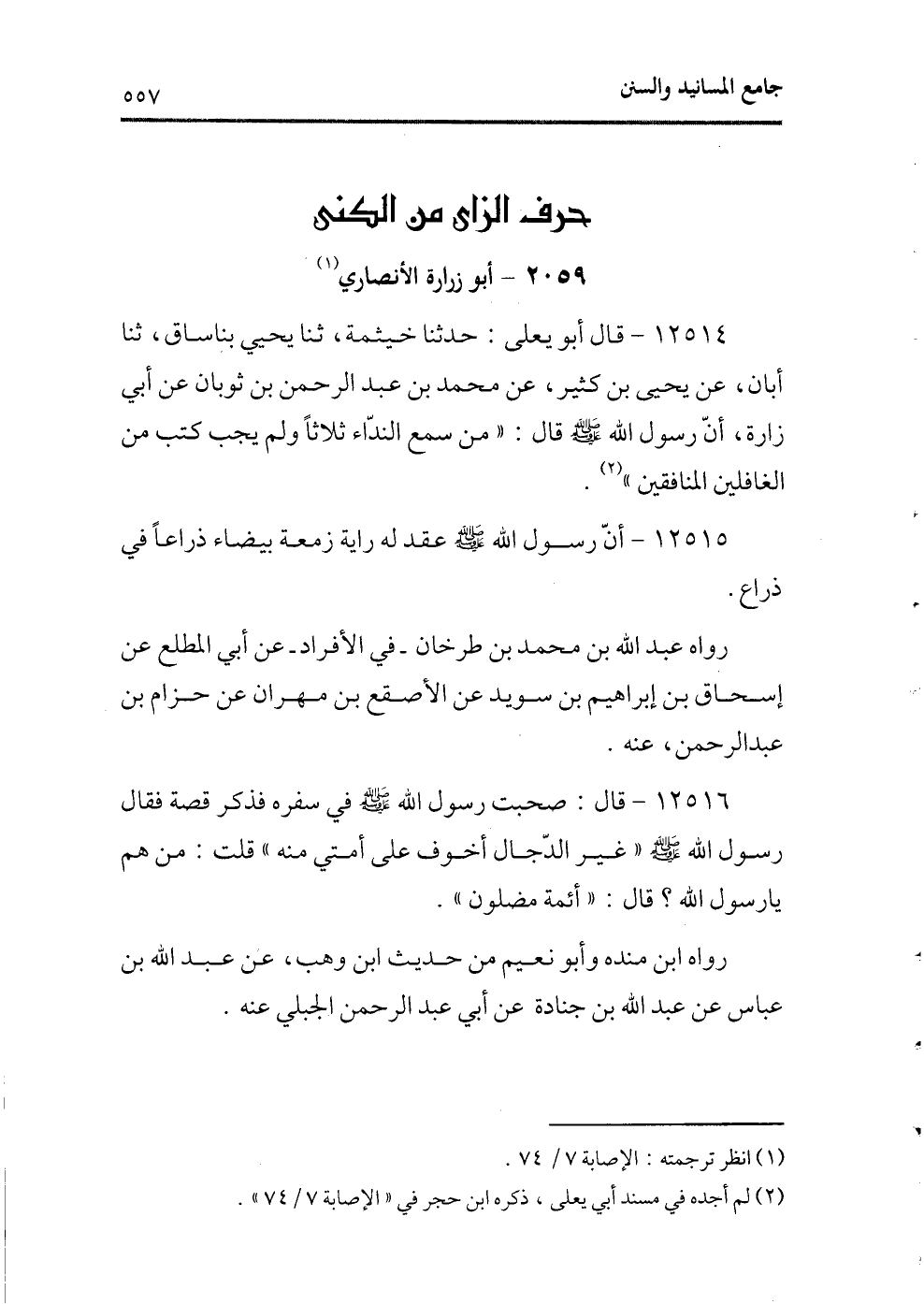 12514 - قال أبو يعلى: حدثنا خيثمة، ثنا يحيى بنا ساق، ثنا أبان، عن يحيى بن كثير، عن محمد بن عبد الرحمن بن ثوبان عن أبى زرارة، أن رسول الله - صلى الله عليه وسلم - قال: «من سمع النداء ثلاثاً ولم يجب كتب من الغافلين المنافقين» (¬2) .