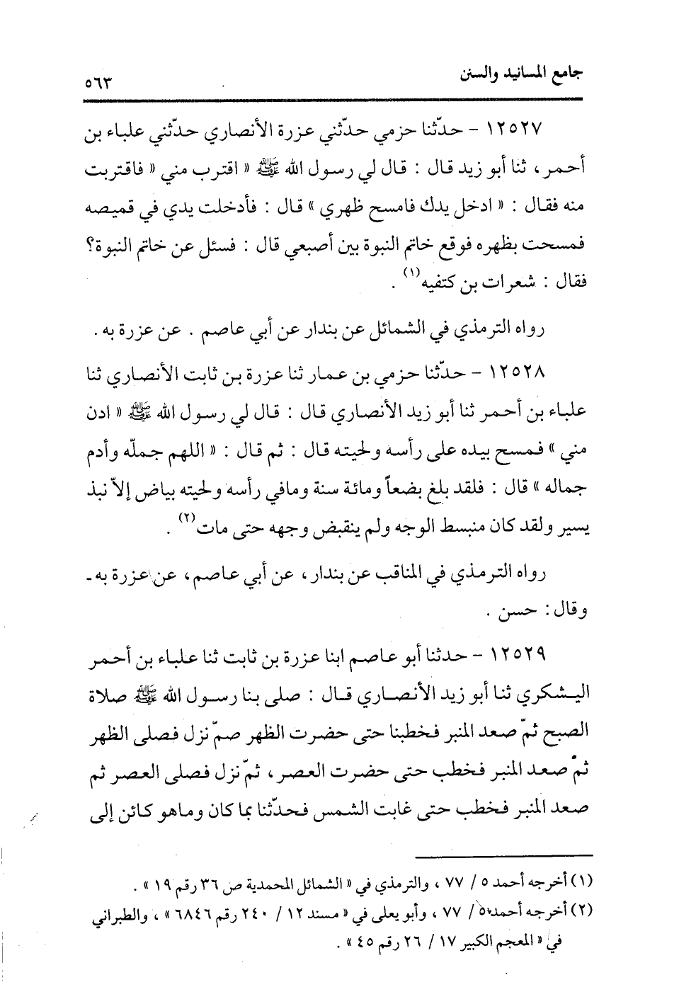 12527 - حدثنا حزمى حدثنى عزرة الأنصارى حدثنى علباء بن أحمر، ثنا أبو زيد قال: قال لى رسول الله - صلى الله عليه وسلم - «اقترب منى» فاقتربت منه فقال: «ادخل يدك فامسح ظهرى» قال: فأدخلت يدى فى قميصه فمسحت بظهره فوقع خاتم النبوة بين أصبعى قال: فسئل عن خاتم النبوة؟ فقال: شعرات بين كتفيه (¬1) .