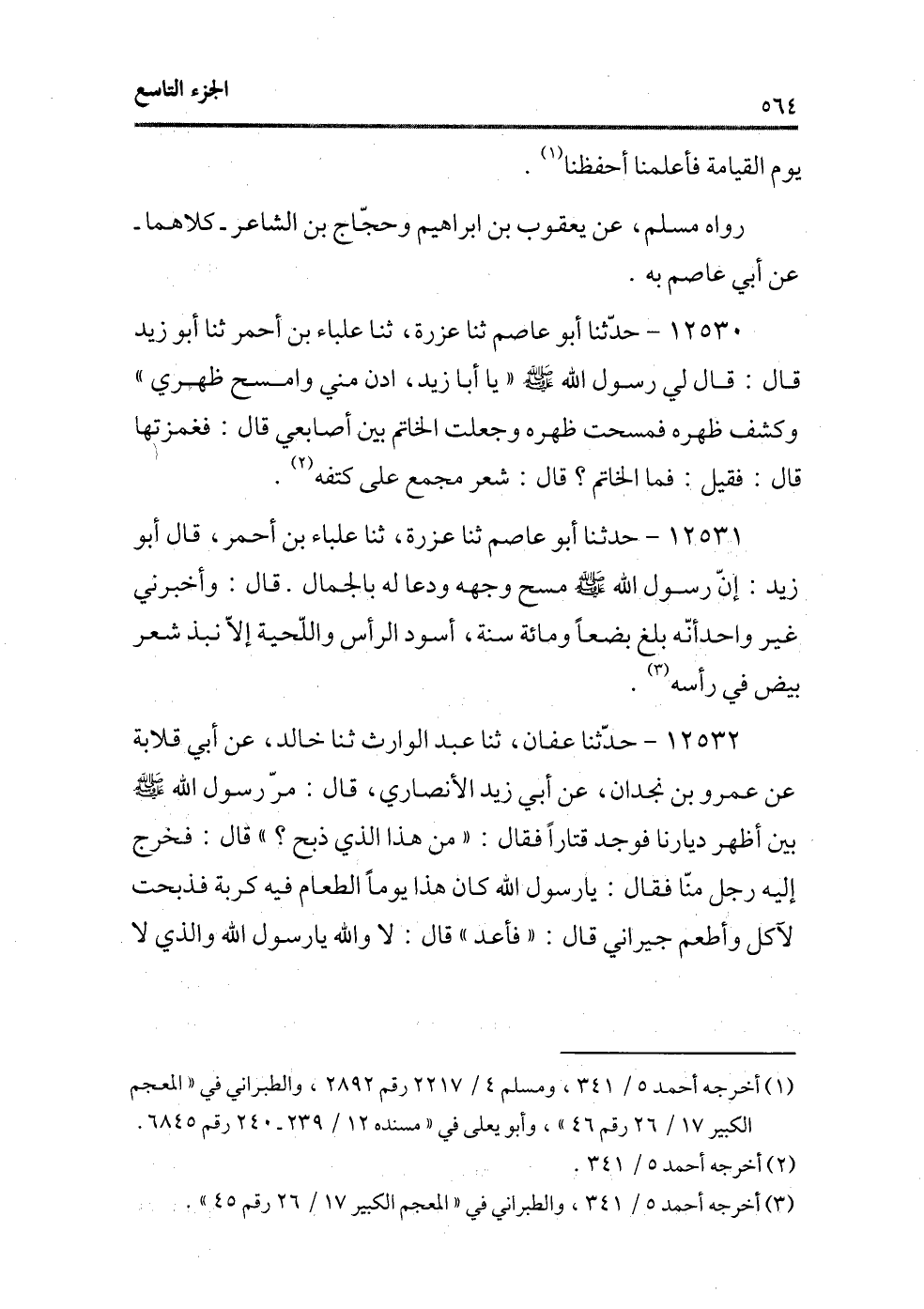 12531 - حدثنا أبو عاصم ثنا عزرة، ثنا علباء بن أحمر، قال أبو زيد: إن رسول الله - صلى الله عليه وسلم - مسح وجهه ودعا له بالجمال. قال: وأخبرنى غير واحد أنه بلغ بضعًا ومائة سنة، أسود الرأس واللحية إلا نبذ شعر بيض فى رأسه (¬2) .