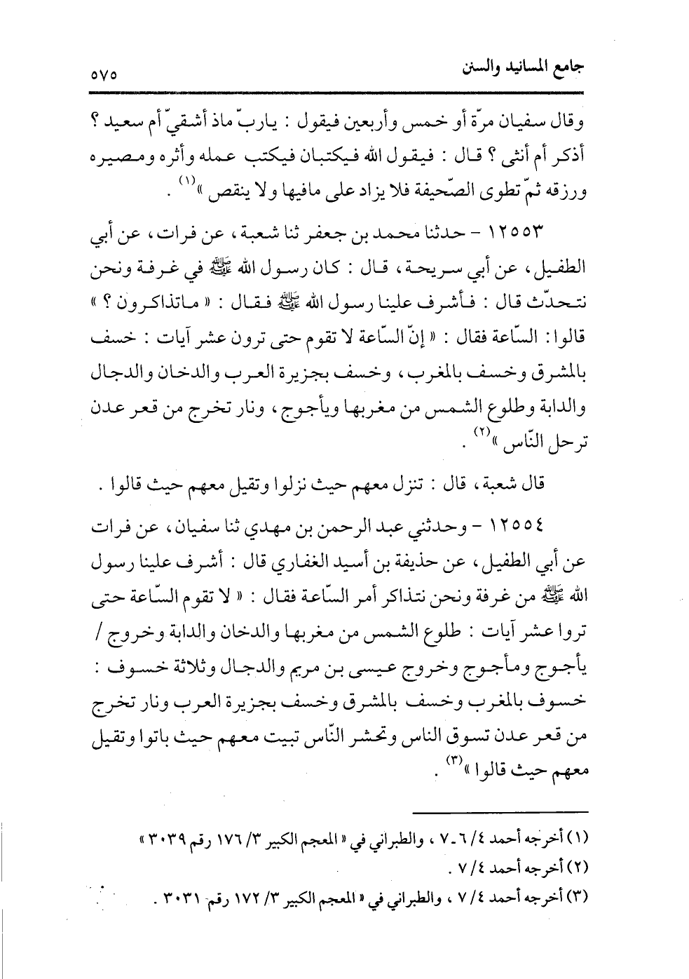 12554 - وحدثنى عبد الرحمن بن مهدى ثنا سفيان، عن فرات عن أبى الطفيل، عن حذيفة بن أسيد الغفارى قال: أشرف علينا رسول الله - صلى الله عليه وسلم - من غرفة ونحن نتذاكر أمر الساعة فقال: «لا تقوم الساعة حتى تروا عشر آيات: طلوع الشمس من مغربها والدخان والدابة وخروج/ يأجوج ومأجوج وخروج عيسى بن مريم والدجال وثلاثة خسوف: خسوف بالمغرب وخسف بالمشرق وخسف بجزيرة العرب ونار تخرج من قعر عدن تسوق الناس وتحشر الناس تبيت معهم حيث باتوا وتقيل معهم حيث قالوا» (¬2) .
