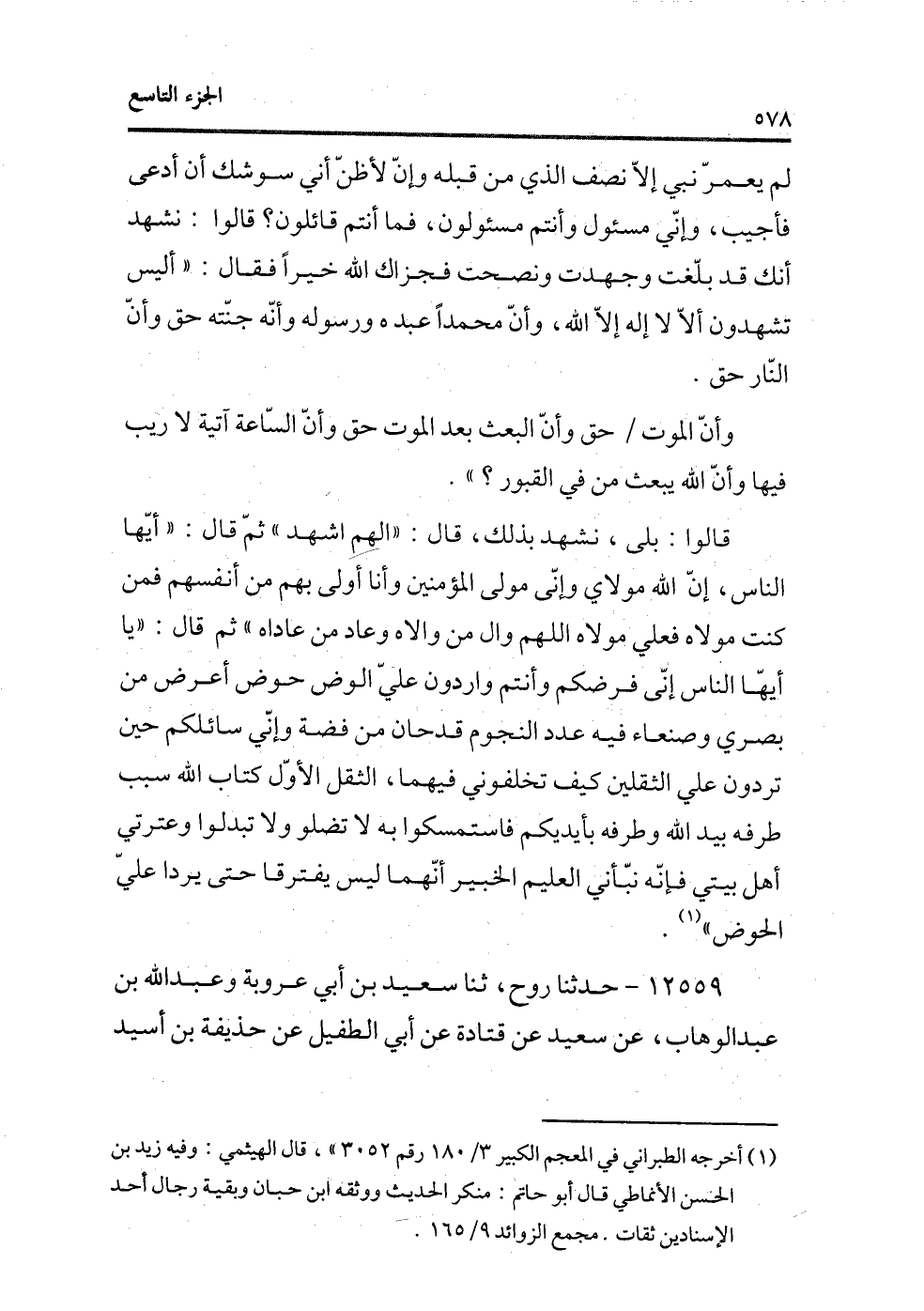 قالوا: بلى، نشهد بذلك، قال: «اللهم اشهد» ثم قال: «أيها الناس، إن الله مولاى وإنى مولى المؤمنين وأنا أولى بهم من أنفسهم فمن كنت مولاه فعلى مولاه اللهم وال من والاه وعاد من عاداه» ثم قال: «يا أيها الناس إنى فرضكم وأنتم واردون عليّ الوض حوض أعرض من بصرى وصنعاء فيه عدد النجوم قدحان من فضة وإنى سائلكم حين تردون علي الثقلين كيف تخلفونى فيهما، الثقل الأول كتاب الله سبب طرفه بيد الله وطرفه بأيديكم فاستمسكوا به لا تضلو ولا تبدلوا وعترتى أهل بيتى فإنه نبأنى العليم الخبير أنهما ليس يفترقا حتى يردا عليّ الحوض» (¬1) .