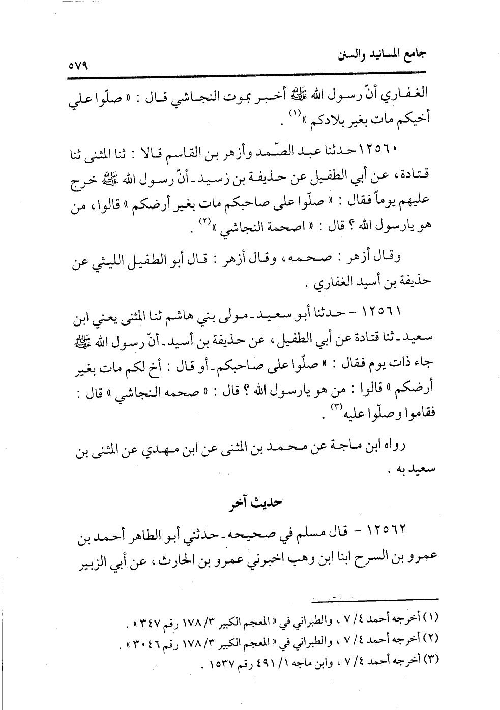 12560 - حدثنا عبد الصمد وأزهر بن القاسم قالا: ثنا المثنى ثنا قتادة، عن أبى الطفيل عن حذيفة بن أسيد ـ أن رسول الله - صلى الله عليه وسلم - خرج عليهم يومًا فقال: «صلوا على صاحبكم مات بغير أرضكم» قالوا، من هو يا رسول الله؟ قال: «أصحمة النجاشى» (¬1) .