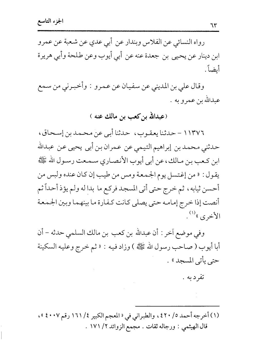 11376 - حدثنا يعقوب، حدثنا أبى عن محمد بن إسحاق، حدثنى محمد ابن إبراهيم التيمى عن عمران بن أبى يحيى عن عبد الله بن كعب بن مالك، عن أبى أيوب الأنصارى سمعت رسول الله - صلى الله عليه وسلم - يقول: «من إغتسل يوم الجمعة ومس من طيب إن كان عنده ولبس من أحسن ثيابه، ثم خرج حتى أتى المسجد فركع ما بدا له ولم يؤذ أحدًا ثم أنصت إذا خرج إمامه حتى يصلى كانت كفارة ما بينهما وبين الجمعة الأخرى» (¬1) .