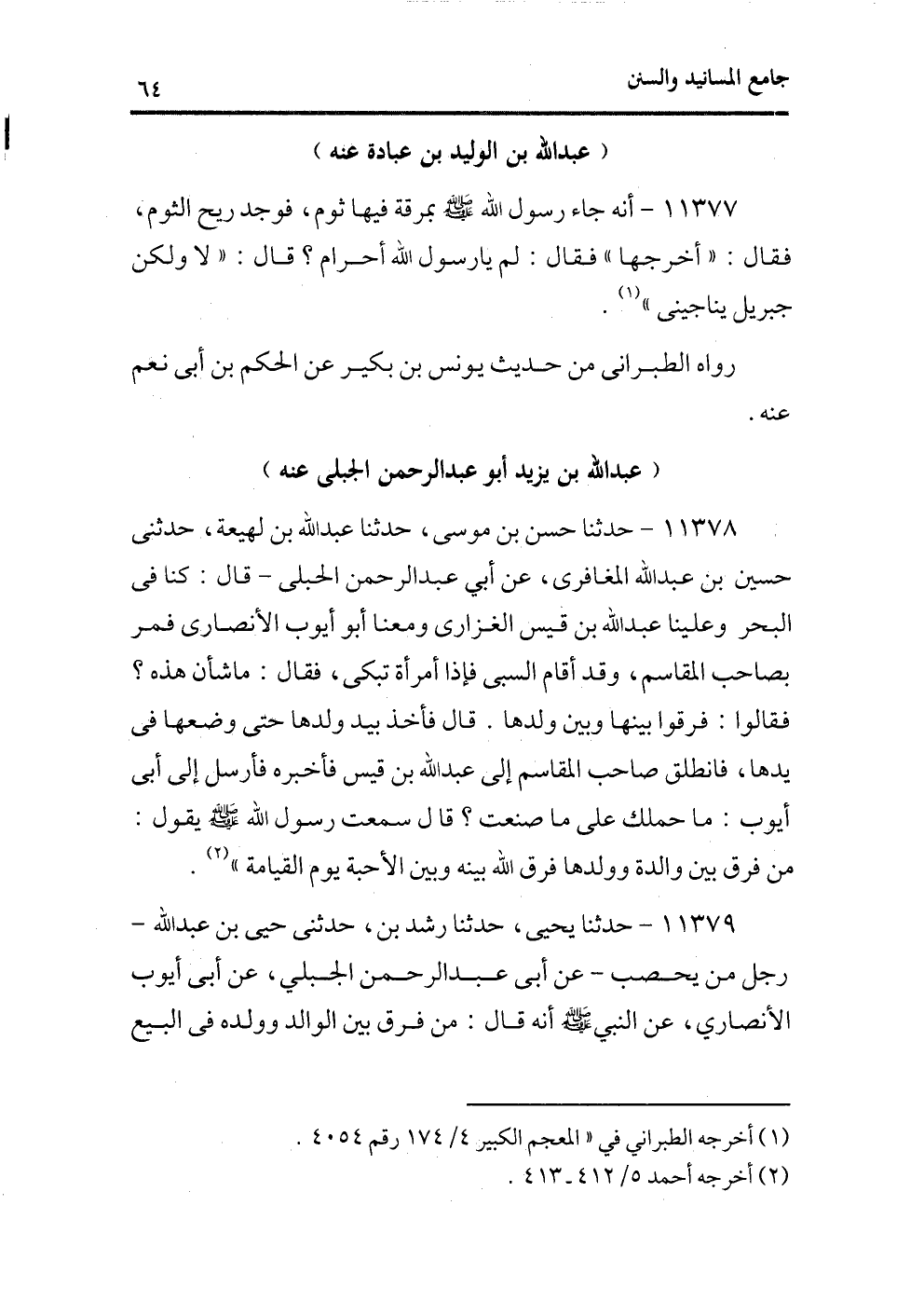 11378 - حدثنا حسن بن موسى، حدثنا عبد الله بن لهيعة، حدثنى حسين ابن عبد الله المغافرى، عن أبى عبد الرحمن الجبلى ـ قال: كنا فى البحر وعلينا عبد الله بن قيس الغزارى ومعنا أبو أيوب الأنصارى فمر بصاحب المقاسم، وقد أقام السبى فإذا امرأة تبكى، فقال: ما شأن هذه؟ فقالوا: فرقوا بينها وبين ولدها. قال فأخذ بيد ولدها حتى وضعها فى يدها، فانطلق صاحب المقاسم إلى عبد الله بن قيس فأخبره فأرسل إلى أبى أيوب: ما حملك على ما صنعت؟ قال سمعت رسول الله - صلى الله عليه وسلم - يقول: من فرق بين والدة وولدها فرق الله بينه وبين الأحبة يوم القيامة» (¬2) .