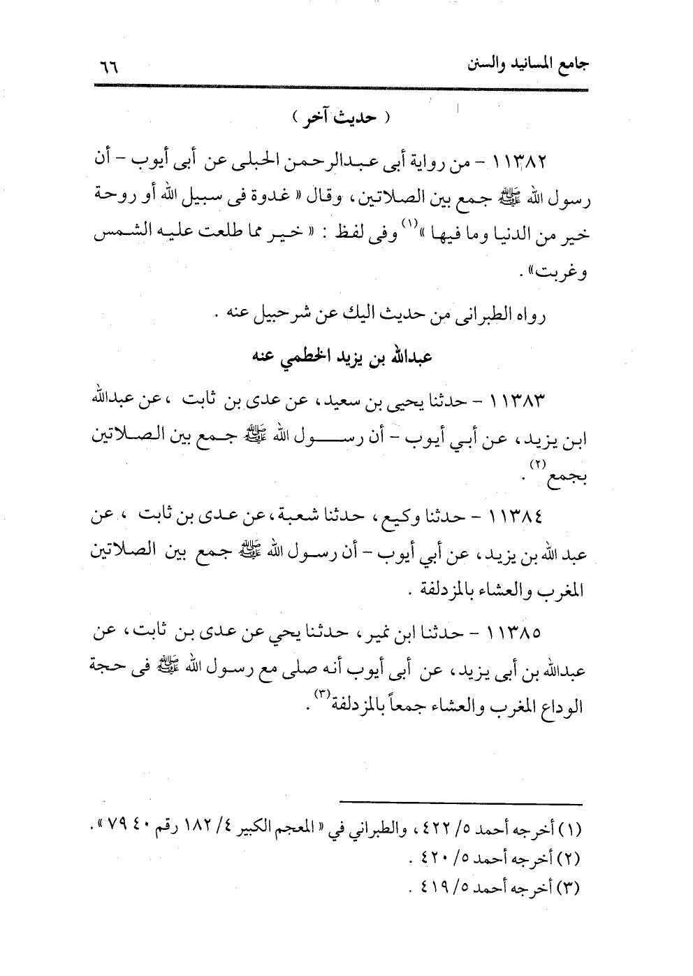 11383 - حدثنا يحيى بن سعيد، عن عدى بن ثابت، عن عبد الله بن يزيد، عن أبى أيوب ـ أن رسول الله جمع بين الصلاتين بجمع (¬2) .