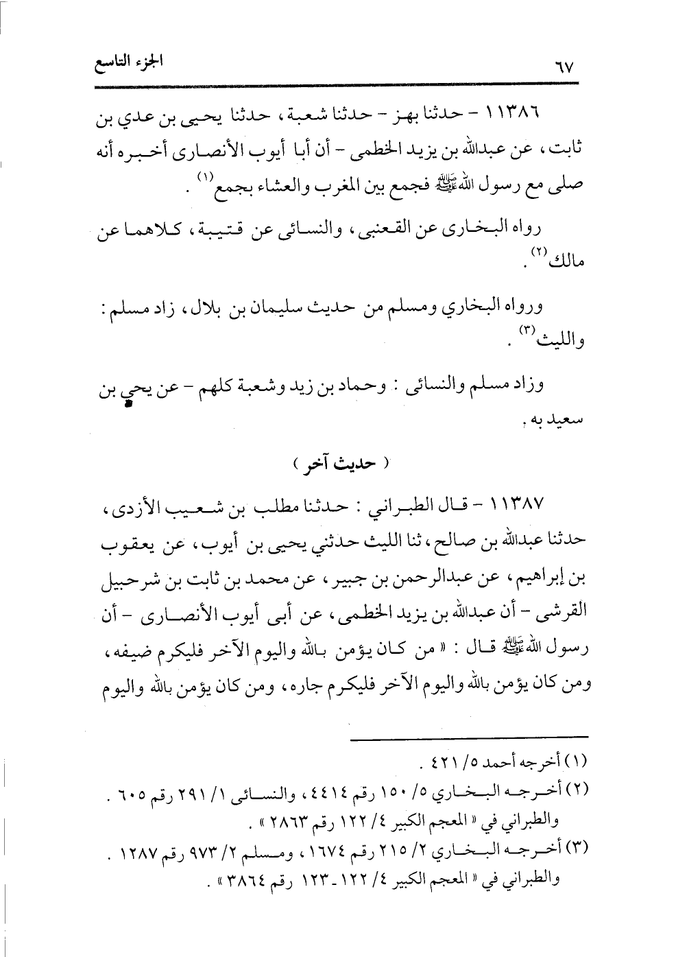 11387 - قال الطبرانى: حدثنا مطلب بن شعيب الأزدى، حدثنا عبد الله ابن صالح، ثنا الليث حدثنى يحيى بن أيوب، عن يعقوب بن إبراهيم، عن عبد الرحمن ابن جبير، عن محمد بن ثابت بن شرحبيل القرشى ـ أن عبد الله بن يزيد الخطمى، عن أبى أيوب الأنصارى ـ أن رسول الله - صلى الله عليه وسلم - قال: «من كان يؤمن بالله واليوم الآخر فليكرم ضيفه، ومن كان يؤمن بالله واليوم الآخر فليكرم جاره، ومن كان يؤمن بالله واليوم