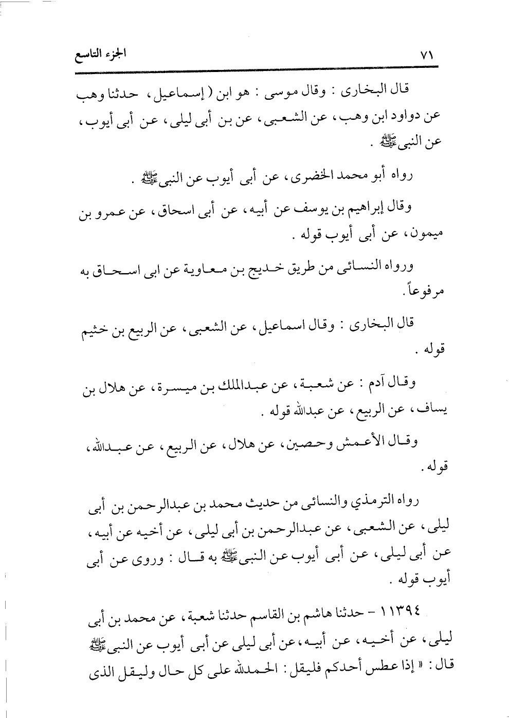 11394 - حدثنا هاشم بن القاسم حدثنا شعبة، عن محمد بن أبى ليلى، عن أخيه، عن أبيه، عن أبى ليلى عن أبى أيوب عن النبى - صلى الله عليه وسلم - قال: «إذا عطس أحدكم فليقل: الحمد لله على كل حال وليقل الذى