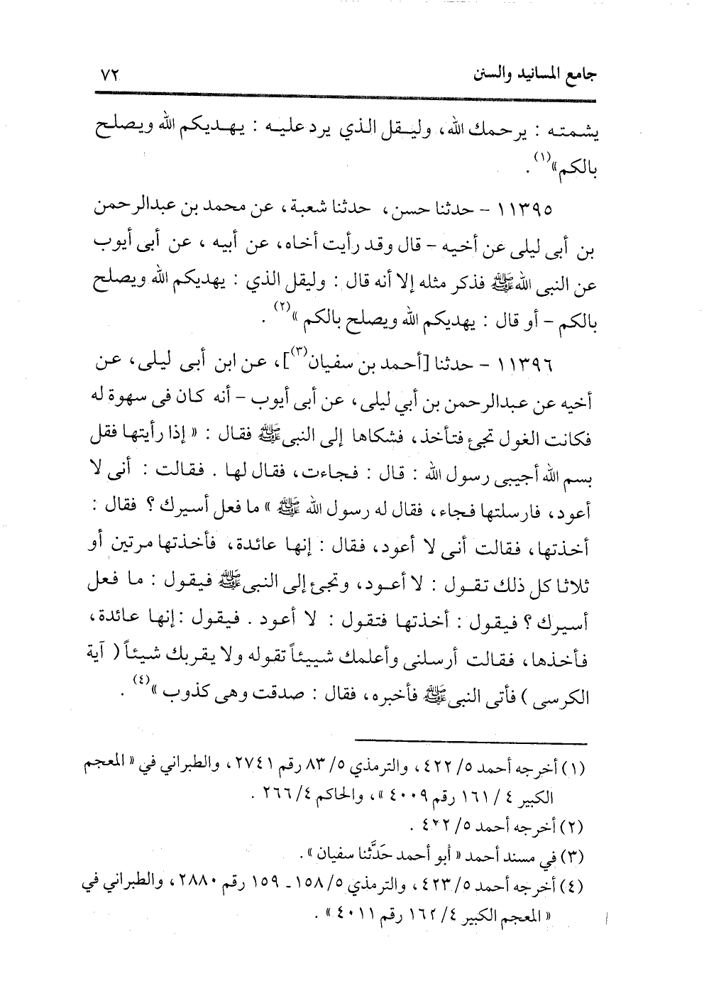 11395 - حدثنا حسن، حدثنا شعبة، عن محمد بن عبد الرحمن بن أبى ليلى عن أخيه ـ قال وقد رأيت أخاه، عن أبيه، عن أبى أيوب عن النبى - صلى الله عليه وسلم - فذكر مثله إلا أنه قال: وليقل الذى: يهديكم الله ويصلح بالكم ـ أو قال: يهديكم الله ويصلح بالكم» (¬1) .