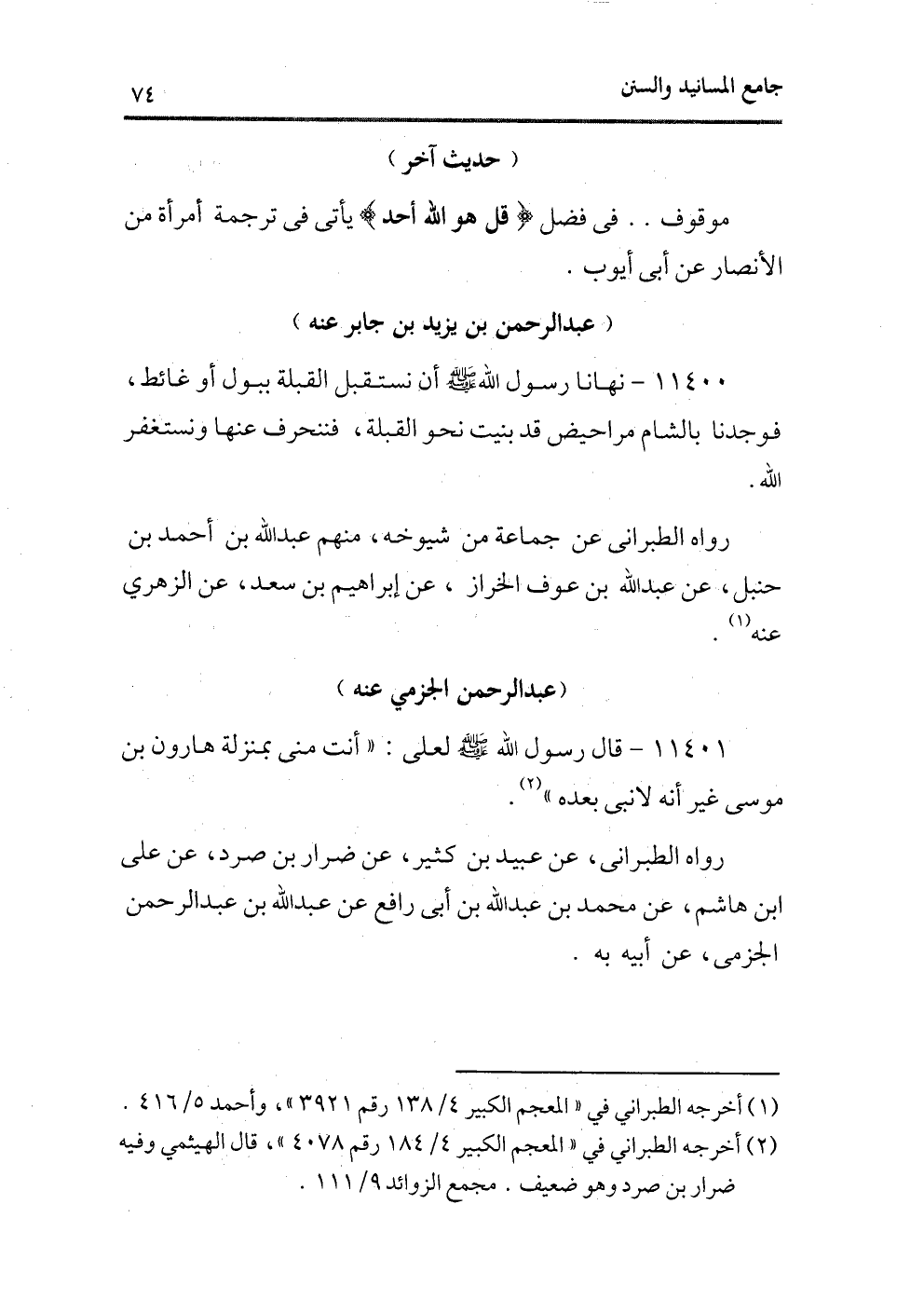 (¬2) أخرجه الطبرانى فى «المعجم الكبير 4/184 رقم4078» ، قال الهيثمى وفيه ضرار بن صرد وهو ضعيف، مجمع الزوائد: 9/111.