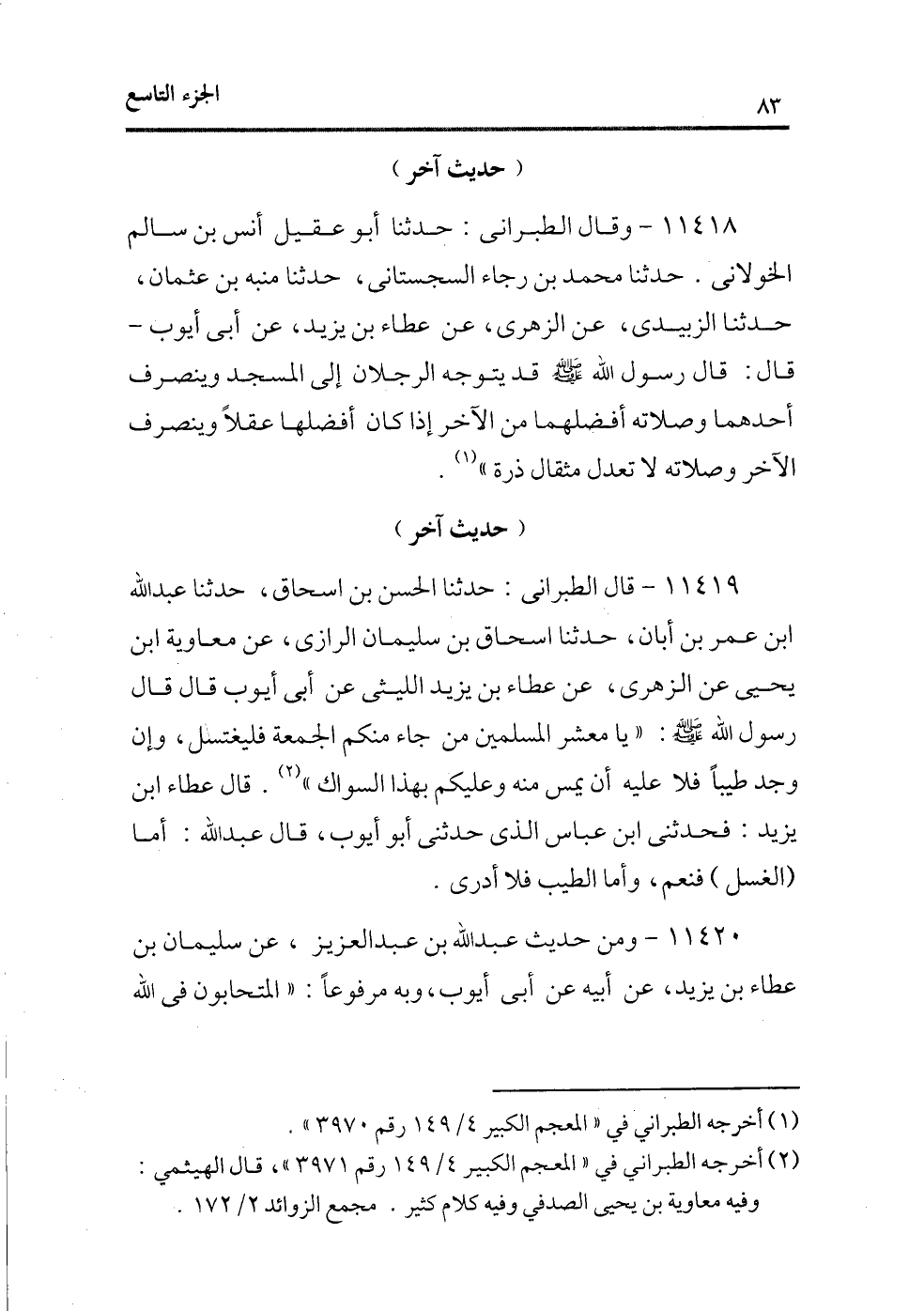 11418 - وقال الطبرانى: حدثنا أبو عقيل أنس بن سالم الخولانى. حدثنا محمد بن رجاء السجستانى، حدثنا منبة بن عثمان، حدثنا الزبيدى، عن الزهرى، عن عطاء بن يزيد، عن أبى أيوب ـ قال: قال رسول الله - صلى الله عليه وسلم - قد يتوجه الرجلان إلى المسجد وينصرف أحدهما وصلاته أفضلهما من الآخر إذا كان أفضلها عقلاً وينصرف الآخر وصلاته لا تعدل مثقال ذرة» (¬1) .