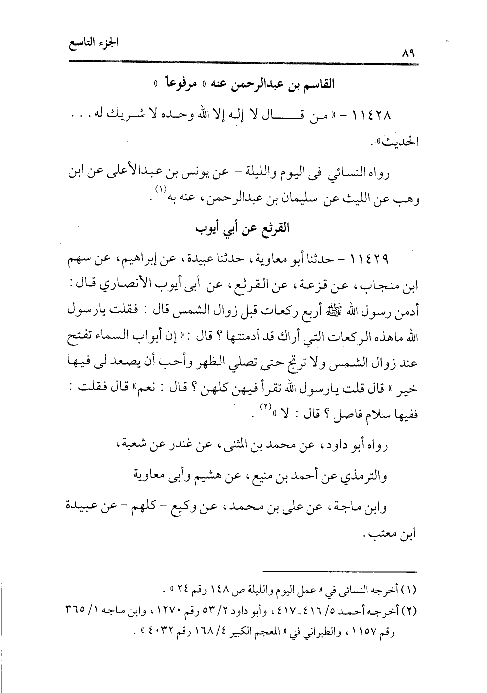 11429 - حدثنا أبو معاوية، حدثنا عبيدة، عن إبراهيم، عن سهم ابن منجاب، عن قزعة، عن القرثع، عن أبى أيوب الأنصارى قال: أدمن رسول الله - صلى الله عليه وسلم - أربع ركعات قبل زوال الشمس قال: فقلت يا رسول الله ما هذه الركعات التى أراك قد أدمنتها؟ قال: «إن أبواب السماء تفتح عند زوال الشمس ولا ترتج حتى تصلى الظهر وأحب أن يصعد لى فيها خير» قال قلت يا رسول الله تقرأ فيهن كلهن؟ قال: نعم «قال فقلت: ففيها سلام فاصل؟ قال: لا» (¬2) .