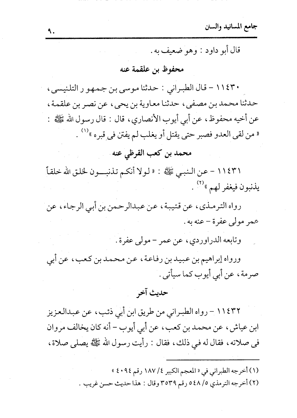 11432 - رواه الطبرانى من طريق ابن أبى ذئب، عن عبد العزيز بن عياش، عن محمد بن كعب، عن أبى أيوب ـ أنه كان يخالف مروان فى صلاته، فقال له فى ذلك، فقال: رأيت رسول الله - صلى الله عليه وسلم - يصلى صلاة،
