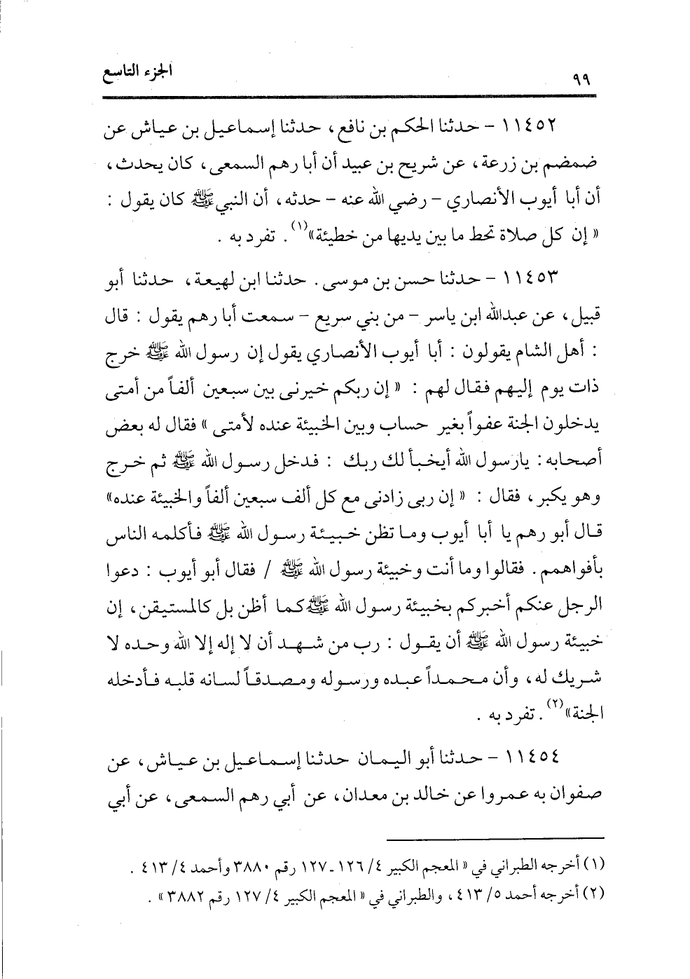 11453 - حدثنا حسن بن موسى. حدثنا ابن لهيعة، حدثنا أبو قبيل، عن عبد الله ابن ياسر ـ من بنى سريع ـ سمعت أبا رهم يقول: قال: أهل الشام يقولون: أبا أيوب الأنصارى يقول إن رسول الله - صلى الله عليه وسلم - خرج ذات يوم إليهم فقال لهم: «إن ربكم خيرنى بين سبعين ألفًا من أمتى يدخلون الجنة عفوًا بغير حساب وبين الخبيئة عنده لأمتى» فقال له بعض أصحابه: يا رسول الله أيخبأ لك ربك: فدخل رسول الله - صلى الله عليه وسلم - ثم خرج وهو يكبر، فقال: «إن ربى زادنى مع كل ألف سبعين ألفًا والخبيئة عنده» قال أبو رهم يا أبا أيوب وما تظن خبيئة رسول الله - صلى الله عليه وسلم - فأكلمه الناس بأفواههم. فقالوا وما أنت وخبيئة رسول الله - صلى الله عليه وسلم - / فقال أبو أيوب: دعوا الرجل عنكم أخبركم بخبيئة رسول الله - صلى الله عليه وسلم - كما أظن بل كالمستيقن، إن خبيئة رسول الله - صلى الله عليه وسلم - أن يقول: «رب من شهد أن لا إله إلا الله وحده لا شريك له، وأن محمدًا عبده ورسوله ومصدقًا لسانه قلبه فأدخله الجنة» (¬2) . تفرد به.