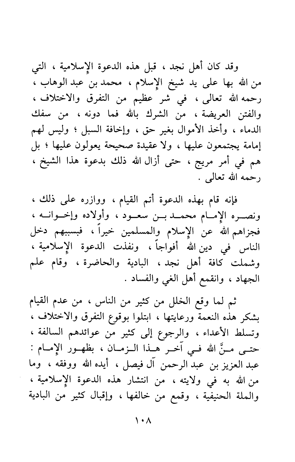 ثم لما وقع الخلل من كثير من الناس، من عدم القيام بشكر هذه النعمة ورعايتها، ابتلوا بوقوع التفرق والاختلاف، وتسلط الأعداء، والرجوع إلى كثير من عوائدهم السالفة، حتى من الله في آخر هذا الزمان، بظهور الإمام عبد العزيز بن عبد الرحمن آل فيصل، أيده الله ووفقه، وما من الله به في ولايته، من انتشار هذه الدعوة الإسلامية، والملة الحنيفية، وقمع من خالفها، وإقبال كثير من البادية