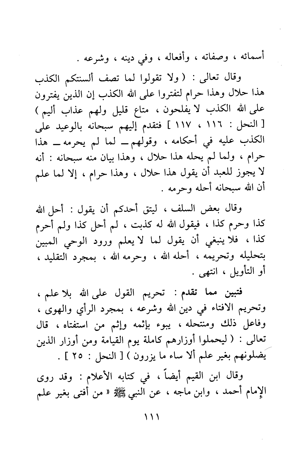 وقال تعالى: {وَلا تَقُولُوا لِمَا تَصِفُ أَلْسِنَتُكُمُ الْكَذِبَ هَذَا حَلالٌ وَهَذَا حَرَامٌ لِتَفْتَرُوا عَلَى اللَّهِ الْكَذِبَ إِنَّ الَّذِينَ يَفْتَرُونَ عَلَى اللَّهِ الْكَذِبَ لا يُفْلِحُونَ مَتَاعٌ قَلِيلٌ وَلَهُمْ عَذَابٌ أَلِيمٌ} [سورة النحل آية: 116-117] فتقدم إليهم سبحانه بالوعيد على الكذب عليه في أحكامه، وقولهم - لما لم يحرمه- هذا حرام، ولما لم يحله: هذا حلال، وهذا بيان منه سبحانه: أنه لا يجوز للعبد أن يقول: هذا حلال، وهذا حرام، إلا لما علم أن الله سبحانه أحله وحرمه.