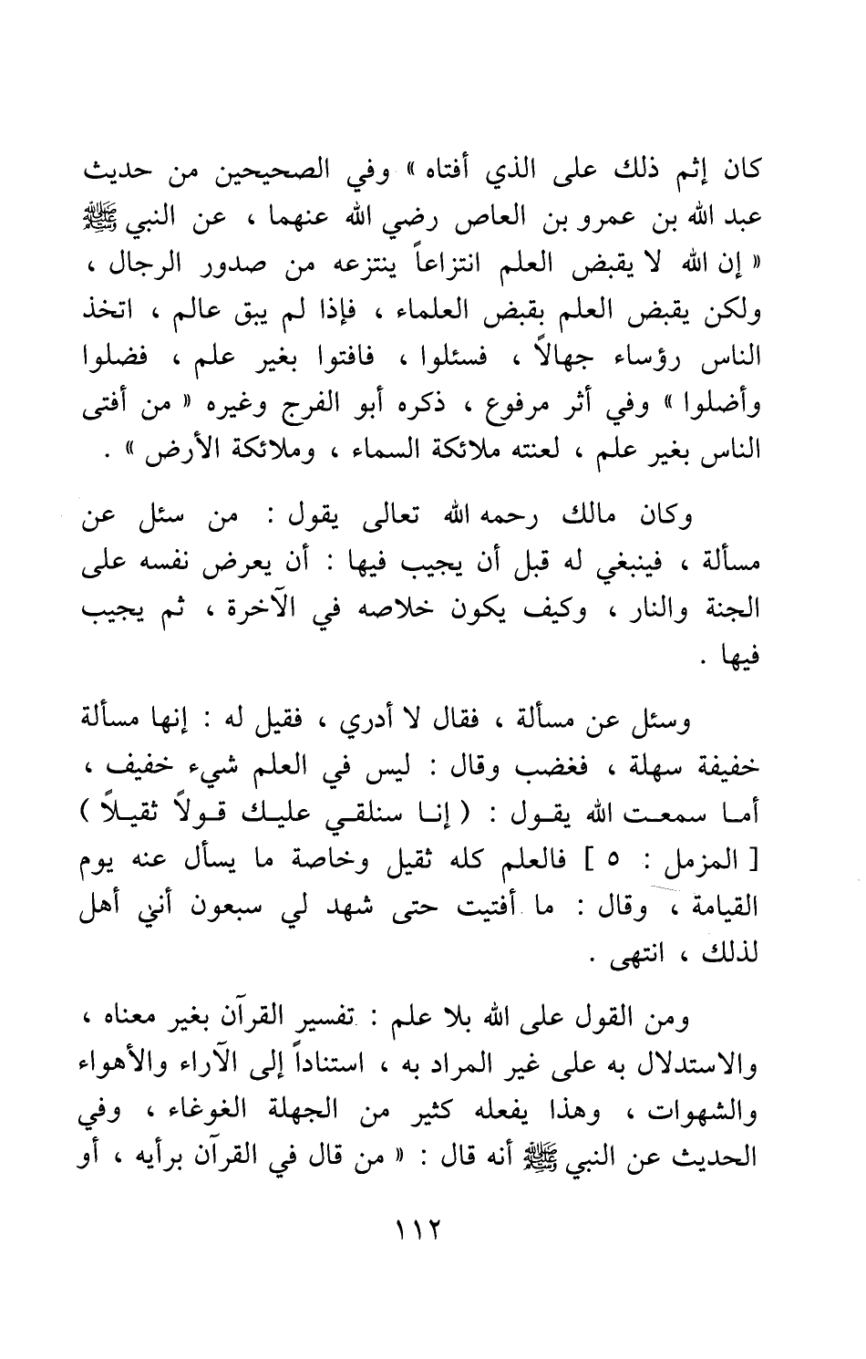 كان إثم ذلك على الذي أفتاه " 1 وفي الصحيحين من حديث عبد الله بن عمرو بن العاص رضي الله عنهما، عن النبي صلى الله عليه وسلم: " إن الله لا يقبض العلم انتزاعا ينتزعه من صدور الرجال، ولكن يقبض العلم بقبض العلماء، فإذا لم يبق عالم، اتخذ الناس رؤساء جهالا، فسئلوا، فأفتوا بغير علم، فضلوا وأضلوا " 2 وفي أثر مرفوع، ذكره أبو الفرج وغيره: " مَن أفتى الناس بغير علم، لعنته ملائكة السماء، وملائكة الأرض ".