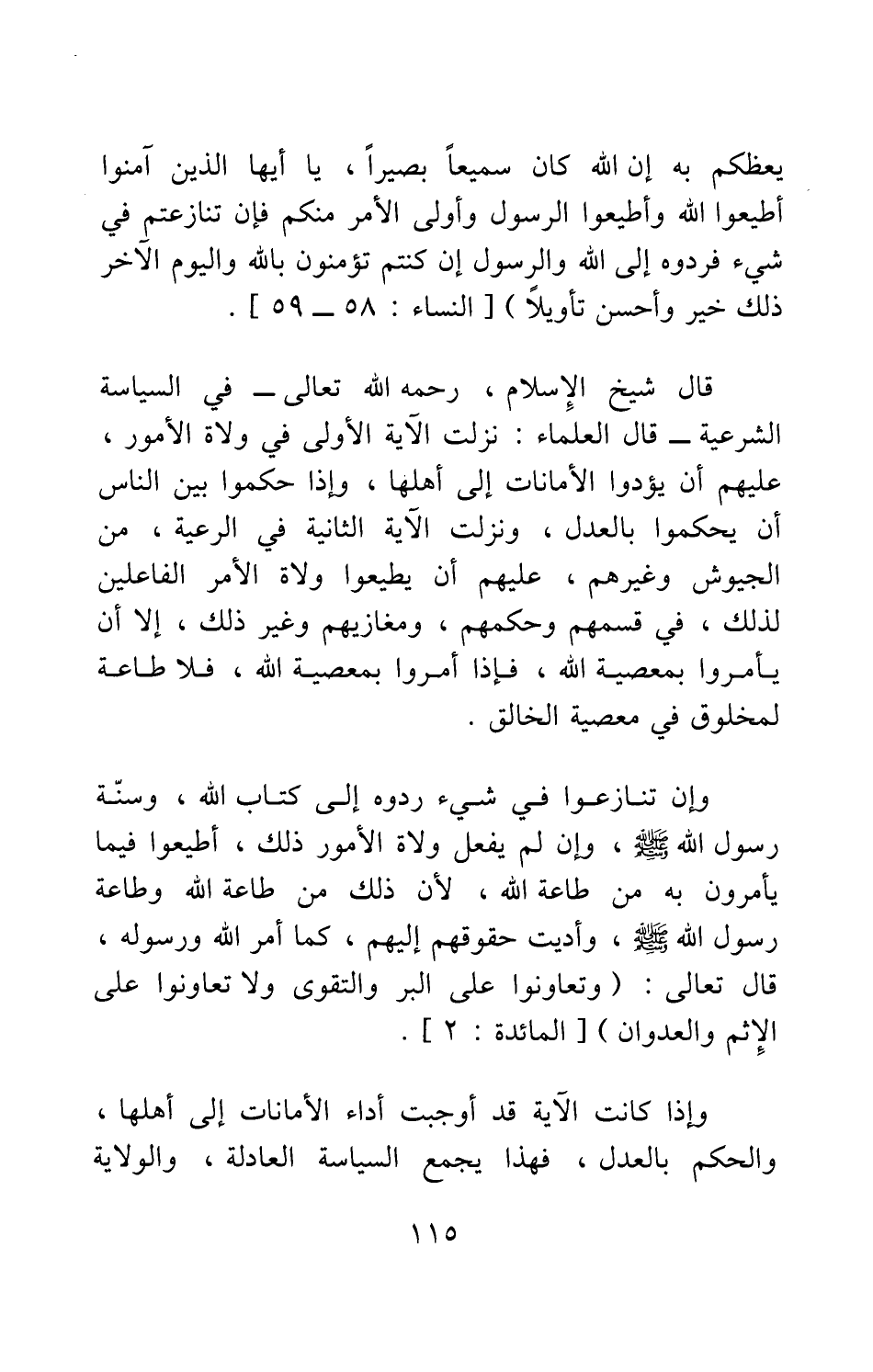 قال شيخ الإسلام، رحمه الله تعالى في "السياسة الشرعية": قال العلماء: نزلت الآية الأولى في ولاة الأمور، عليهم أن يؤدوا الأمانات إلى أهلها، وإذا حكموا بين الناس أن يحكموا بالعدل, ونزلت الآية الثانية في الرعية، من الجيوش وغيرهم، عليهم أن يطيعوا ولاة الامر الفاعلين لذلك، في قسمهم وحكمهم، ومغازيهم وغير ذلك، إلا أن يأمروا بمعصية الله، فإذا أمروا بمعصية الله، فلا طاعة لمخلوق في معصية الخالق.