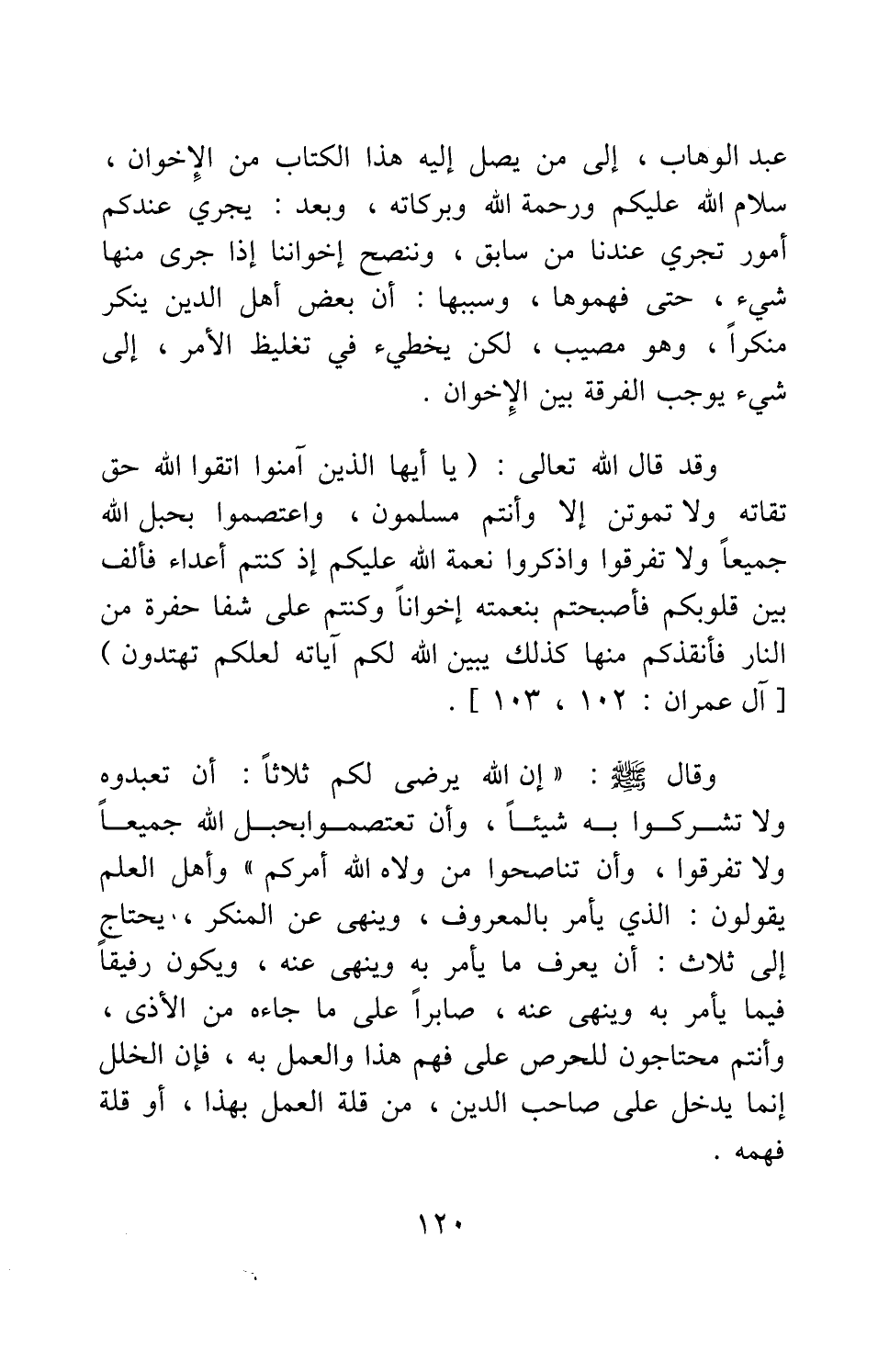 عبد الوهاب، إلى من يصل إليه هذا الكتاب من الإخوان، سلام الله عليكم ورحمة الله وبركاته. وبعد: يجري عندكم أمور تجري عندنا من سابق، وننصح إخواننا إذا جرى منها شيء، حتى فهموها، وسببها: أن بعض أهل الدين ينكر منكرا، وهو مصيب، لكن يخطئ في تغليظ الأمر، إلى شيء يوجب الفرقة بين الإخوان.