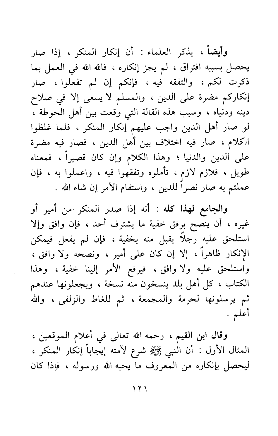 وقال ابن القيم، رحمه الله تعالى في "أعلام الموقعين": المثال الأول: أن النبي صلى الله عليه وسلم شرع لأمته إيجابا إنكار المنكر، ليحصل بإنكاره من المعروف ما يحبه الله ورسوله، فإذا كان