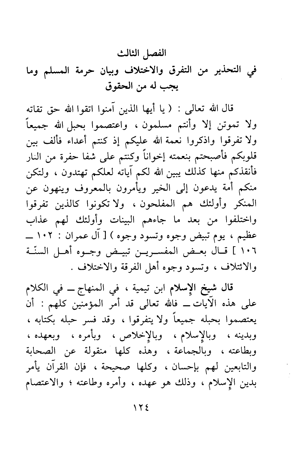 الفصل الثالث: في التحذير من التفرق والاختلاف وبيان حرمة المسلم وما يجب له من الحقوق