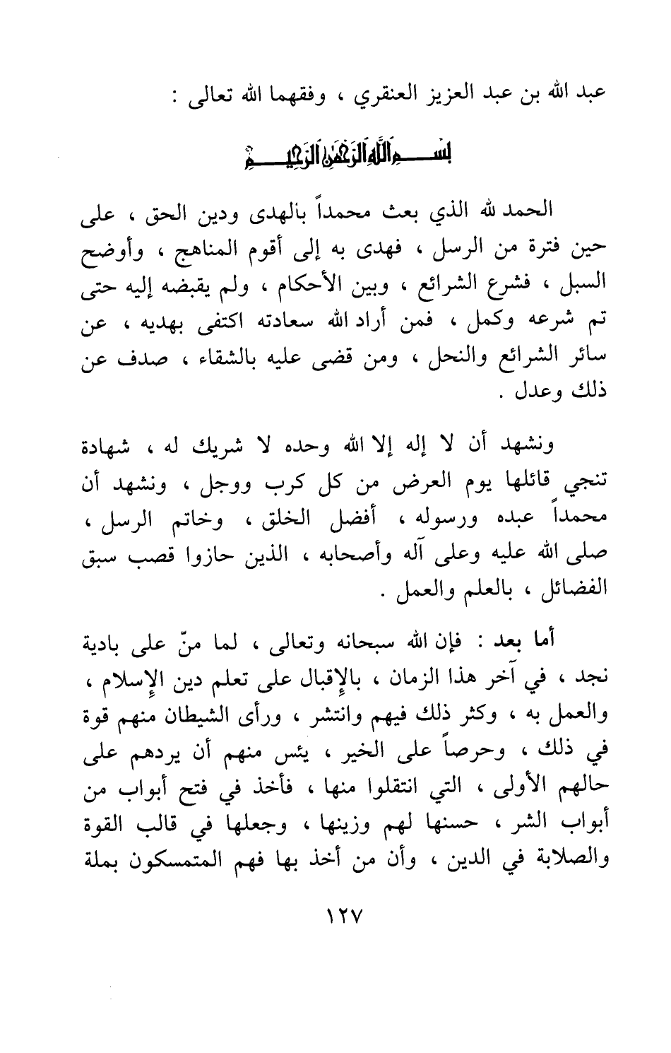 أما بعد: فإن الله سبحانه وتعالى، لما من على بادية نجد، في آخر هذا الزمان، بالإقبال على تعلم دين الإسلام، والعمل به، وكثر ذلك فيهم وانتشر، ورأى الشيطان منهم قوة في ذلك، وحرصا على الخير، يئس منهم أن يردهم على حالهم الأولى، التي انتقلوا منها، فأخذ في فتح أبواب من أبواب الشر، حسنها لهم وزينها، وجعلها في قالب القوة والصلابة في الدين، وأن من أخذ بها فهم المتمسكون بملة