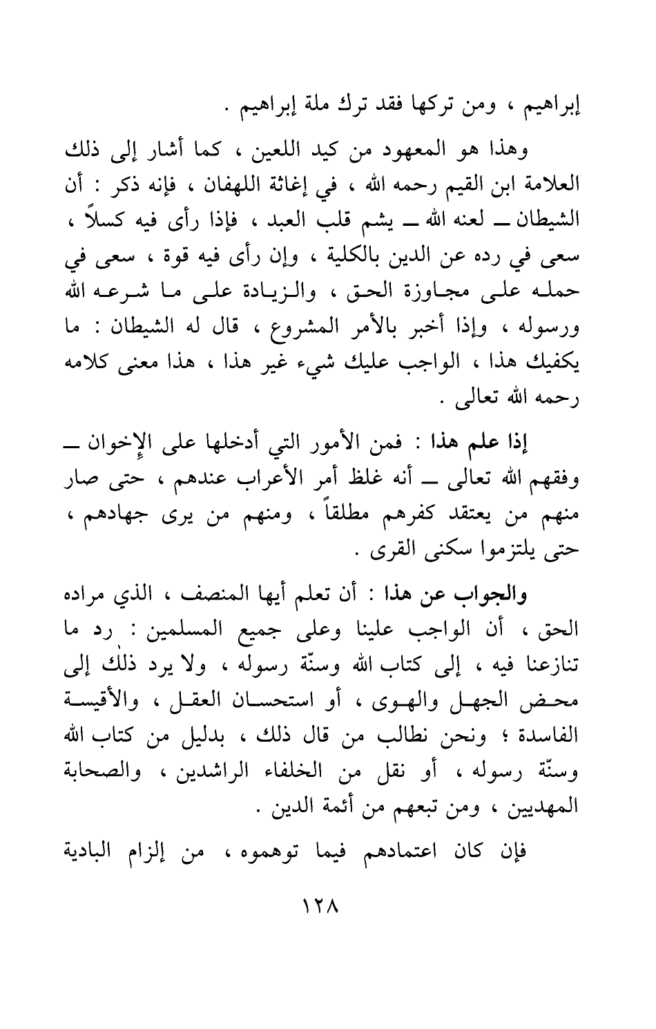 إذا علم هذا؛ فمن الأمور التي أدخلها على الإخوان- وفقهم الله تعالى- أنه غلظ أمر الأعراب عندهم، حتى صار منهم من يعتقد كفرهم مطلقا، ومنهم من يرى جهادهم، حتى يلتزموا سكنى القرى.