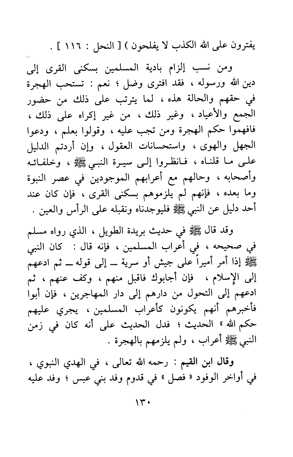 ومن نسب إلزام بادية المسلمين بسكنى القرى إلى دين الله ورسوله، فقد افترى وضل، نعم، تستحب الهجرة في حقهم والحالة هذه، لما يترتب على ذلك من حضور الجمع والأعياد، وغير ذلك، من غير إكراه على ذلك، فافهموا حكم الهجرة ومن تجب عليه، وقولوا بعلم، ودعوا الجهل والهوى، واستحسانات العقول، وإن أردتم الدليل على ما قلناه، فانظروا إلى سيرة النبي صلى الله عليه وسلم وخلفائه وأصحابه، وحالهم مع أعرابهم الموجودين في عصر النبوة وما بعده، فإنهم لم يلزموهم بسكنى القرى، فإن كان عند أحد دليل عن النبي صلى الله عليه وسلم فليوجدناه ونقبله على الرأس والعين.