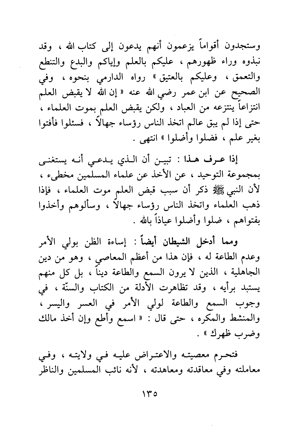 إذا عرف هذا تبين أن الذي يدعي أنه يستغنى بمجموعة التوحيد، عن الأخذ عن علماء المسلمين مخطئ، لأن النبي صلى الله عليه وسلم ذكر أن سبب قبض العلم موت العلماء، فإذا ذهب العلماء واتخذ الناس رؤساء جهالا، وسألوهم وأخذوا بفتواهم، ضلوا وأضلوا، عياذا بالله.