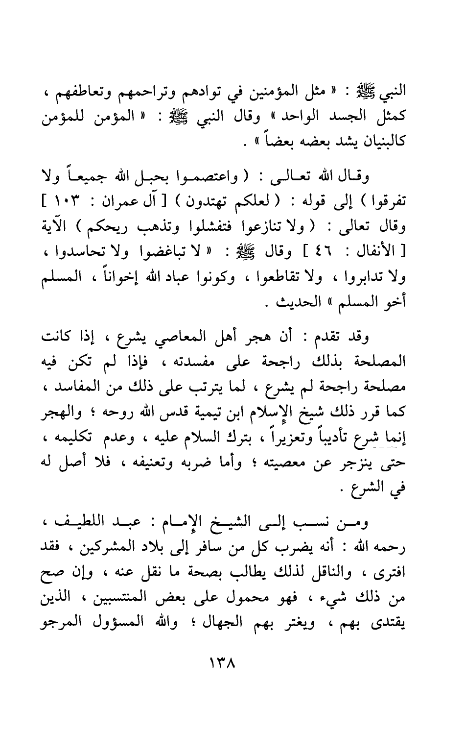 وقال الله تعالى: {وَاعْتَصِمُوا بِحَبْلِ اللَّهِ جَمِيعاً وَلا تَفَرَّقُوا} [سورة آل عمران آية: 103] إلى قوله: {لَعَلَّكُمْ تَهْتَدُونَ} [سورة البقرة آية: 53] وقال تعالى: {وَلا تَنَازَعُوا فَتَفْشَلُوا وَتَذْهَبَ رِيحُكُمْ} [سورة الأنفال آية: 46] الآية وقال صلى الله عليه وسلم " لا تباغضوا ولا تحاسدوا، ولا تدابروا، ولا تقاطعوا، وكونوا عباد الله إخوانا، المسلم أخو المسلم " 3 الحديث.