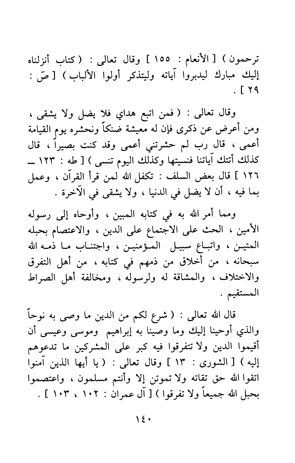 وقال تعالى: {كِتَابٌ أَنْزَلْنَاهُ إِلَيْكَ مُبَارَكٌ لِيَدَّبَّرُوا آيَاتِهِ وَلِيَتَذَكَّرَ أُولُو الأَلْبَابِ} [سورة ص آية: 29] وقال تعالى: {فَمَنِ اتَّبَعَ هُدَايَ فَلا يَضِلُّ وَلا يَشْقَى وَمَنْ أَعْرَضَ عَنْ ذِكْرِي فَإِنَّ لَهُ مَعِيشَةً ضَنْكاً وَنَحْشُرُهُ يَوْمَ الْقِيَامَةِ أَعْمَى قَالَ رَبِّ لِمَ حَشَرْتَنِي أَعْمَى وَقَدْ كُنْتُ بَصِيراً قَالَ كَذَلِكَ أَتَتْكَ آيَاتُنَا فَنَسِيتَهَا وَكَذَلِكَ الْيَوْمَ تُنْسَى} [سورة طه آية: 123-126] قال بعض السلف: تكفل الله لمن قرأ القرآن، وعمل بما فيه، أن لا يضل في الدنيا، ولا يشقى في الآخرة.
