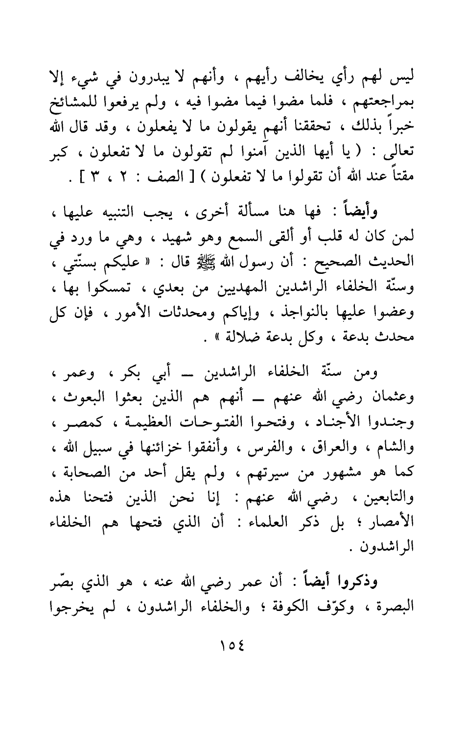 وأيضا: فها هنا مسألة أخرى، يجب التنبيه عليها، لمن كان له قلب أو ألقى السمع وهو شهيد، وهي ما ورد في الحديث الصحيح: أن رسول الله صلى الله عليه وسلم قال: " عليكم بسنتي، وسنة الخلفاء الراشدين المهديين من بعدي، تمسكوا بها، وعضوا عليها بالنواجذ، وإياكم ومحدثات الأمور، فإن كل محدثة بدعة، وكل بدعة ضلالة " 1.