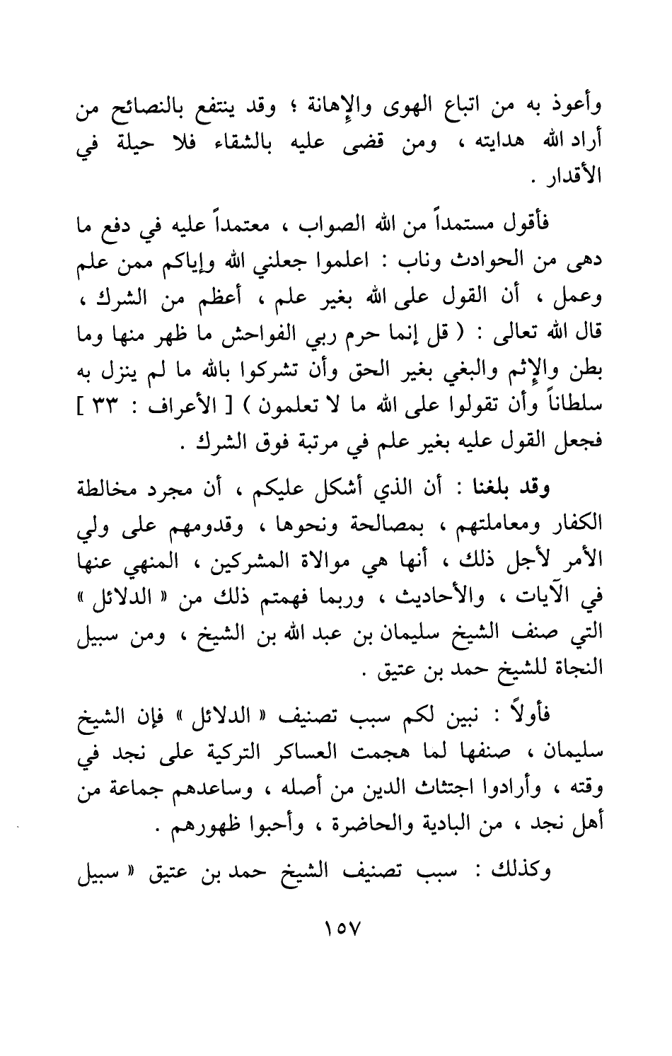 فأولا: نبين لكم سبب تصنيف "الدلائل"، فإن الشيخ سليمان، صنفها لما هجمت العساكر التركية على نجد في وقته، وأرادوا اجتثاث الدين من أصله، وساعدهم جماعة من أهل نجد، من البادية والحاضرة، وأحبوا ظهورهم.