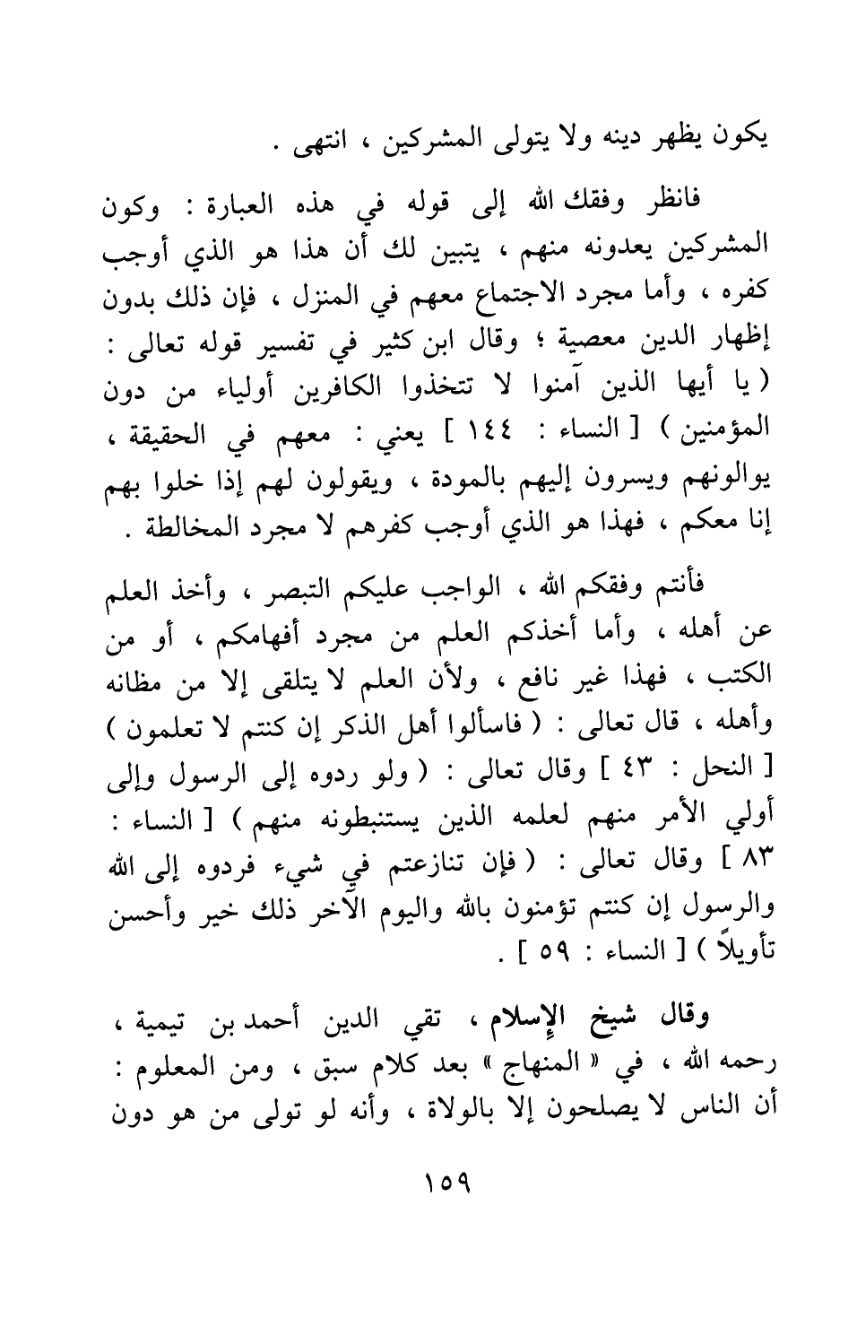 فانظر وفقك الله إلى قوله في هذه العبارة: وكون المشركين يعدونه منهم، يتبين لك أن هذا هو الذي أوجب كفره، وأما مجرد الاجتماع معهم في المنزل، فإن ذلك بدون إظهار الدين معصية، وقال ابن كثير في تفسير قوله تعالى: {يَا أَيُّهَا الَّذِينَ آمَنُوا لا تَتَّخِذُوا الْكَافِرِينَ أَوْلِيَاءَ مِنْ دُونِ الْمُؤْمِنِينَ} [سورة النساء آية: 144] يعني: معهم في الحقيقة، يوالونهم ويسرون إليهم بالمودة، ويقولون لهم إذا خلوا بهم إنا معكم، فهذا هو الذي أوجب كفرهم لا مجرد المخالطة.