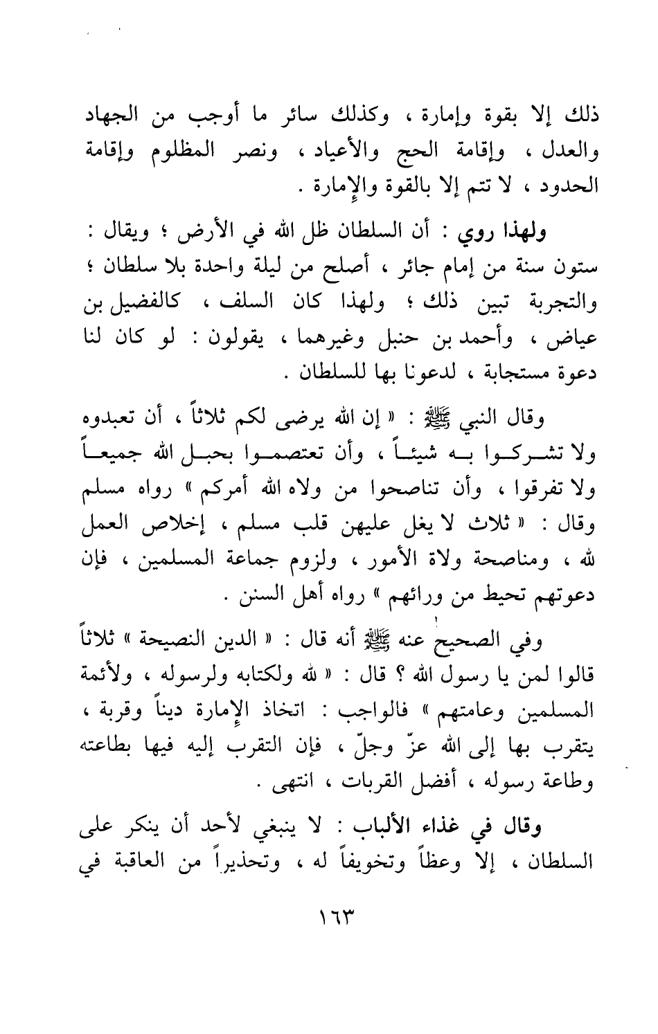 وفي الصحيح عنه صلى الله عليه وسلم أنه قال: " الدين النصيحة، ثلاثا. قالوا: لمن يا رسول الله؟ قال: لله، ولكتابه، ولرسوله، ولأئمة المسلمين وعامتهم "3, فالواجب: اتخاذ الإمارة دينا وقربة، يتقرب بها إلى الله عز وجل، فإن التقرب إليه فيها بطاعته وطاعة رسوله، أفضل القربات، انتهى.