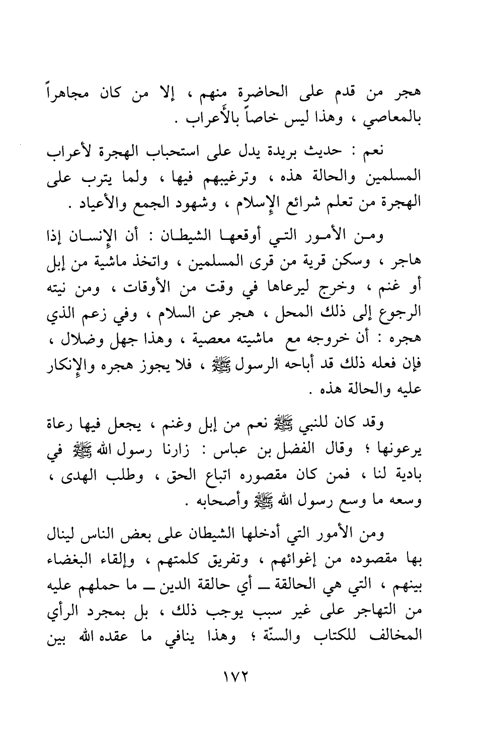 نعم حديث بريدة يدل على استحباب الهجرة لأعراب المسلمين والحالة هذه، وترغيبهم فيها، ولما يترب على الهجرة من تعلم شرائع الإسلام، وشهود الجمع والأعياد. ومن الأمور التي أوقعها الشيطان: أن الإنسان إذا هاجر، وسكن قرية من قرى المسلمين، واتخذ ماشية من إبل أو غنم، وخرج ليرعاها في وقت من الأوقات، ومن نيته الرجوع إلى ذلك المحل، هجر عن السلام، وفي زعم الذي هجره: أن خروجه مع ماشيته معصية؛ وهذا جهل وضلال، فإن فعله ذلك قد أباحه الرسول صلى الله عليه وسلم فلا يجوز هجره والإنكار عليه والحالة هذه.