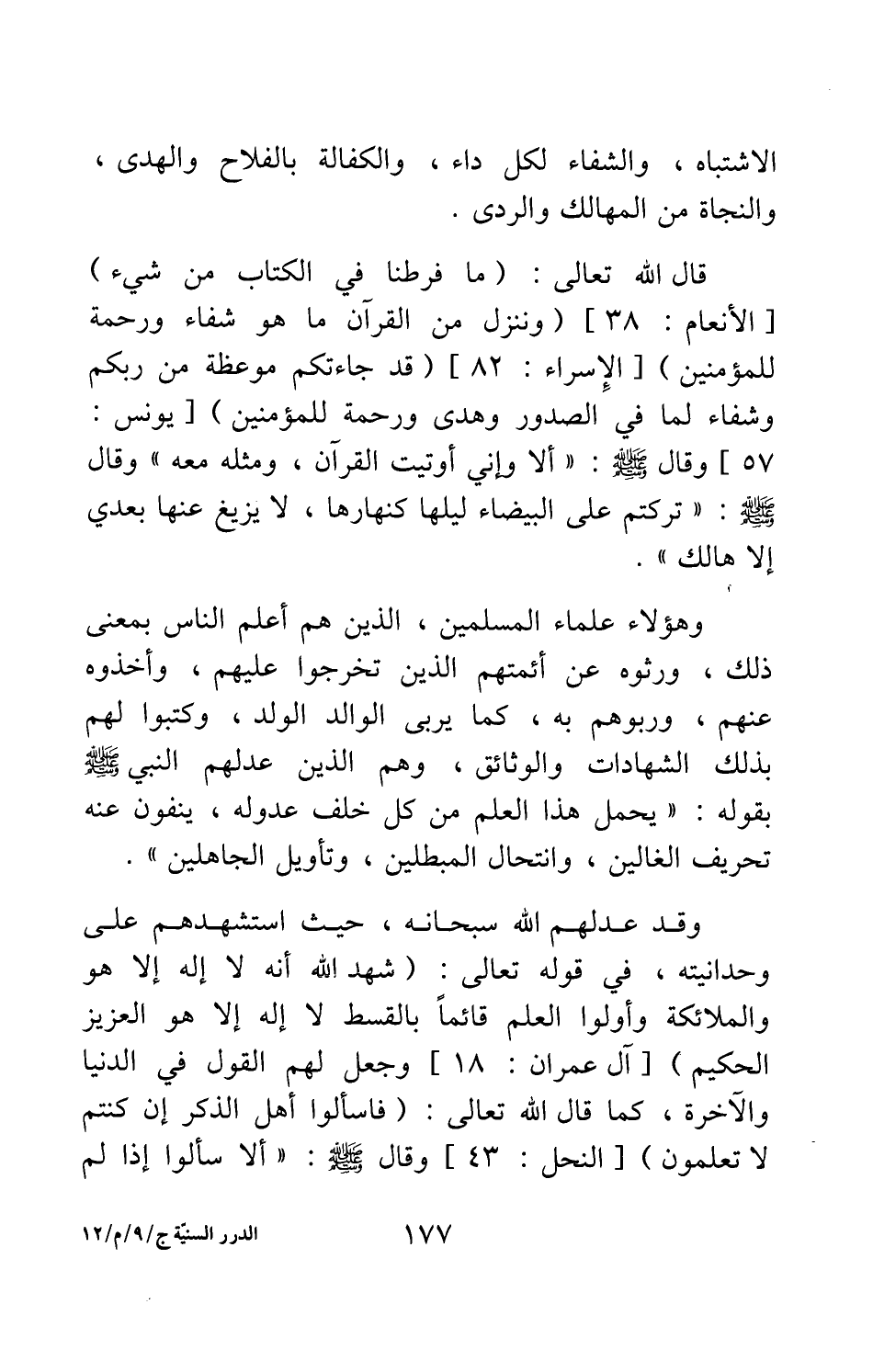 الاشتباه، والشفاء لكل داء، والكفالة بالفلاح والهدى، والنجاة من المهالك والردى.
