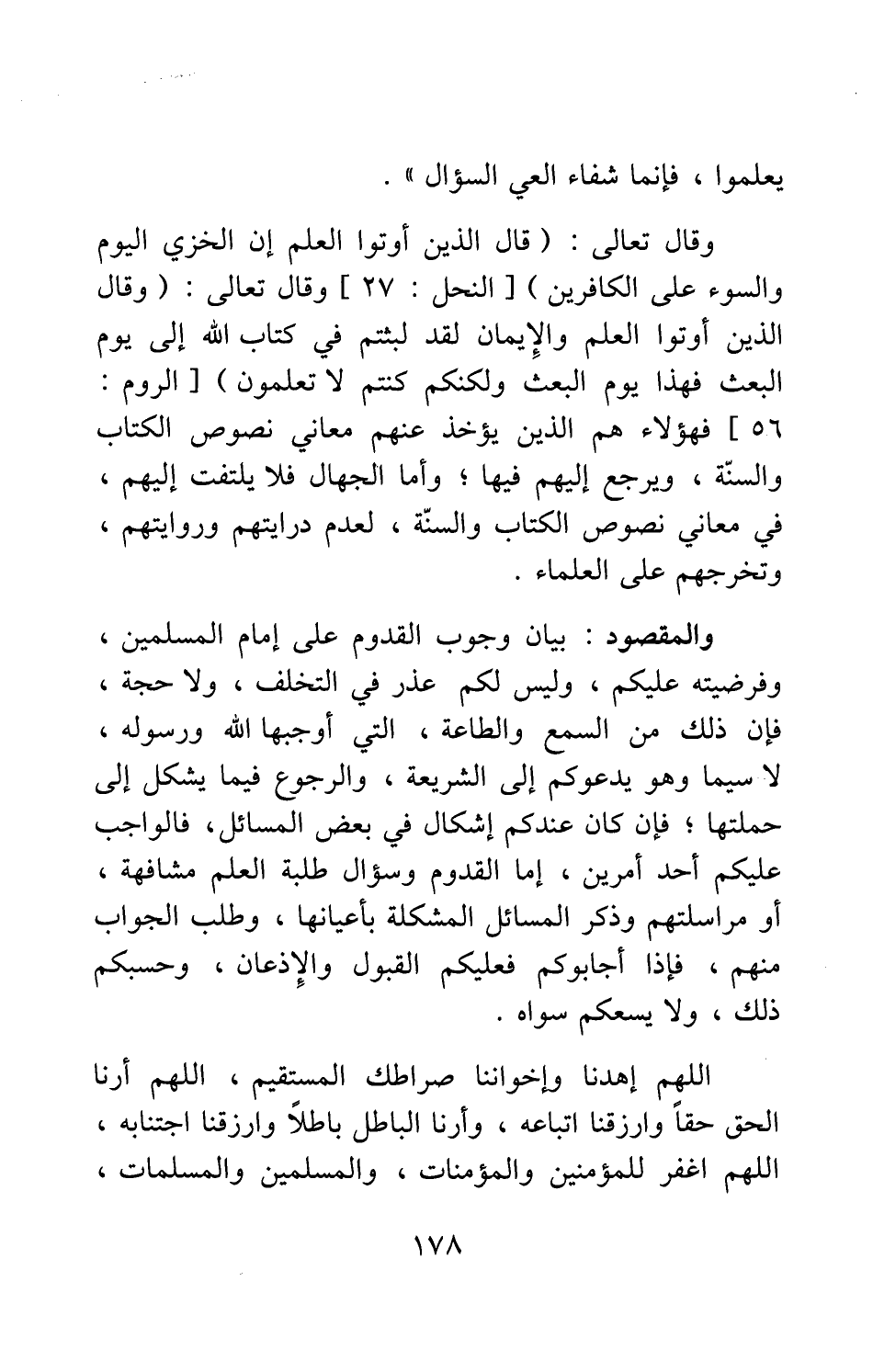 والمقصود: بيان وجوب القدوم على إمام المسلمين، وفرضيته عليكم، وليس لكم عذر في التخلف، ولا حجة، فإن ذلك من السمع والطاعة، التي أوجبها الله ورسوله، لا سيما وهو يدعوكم إلى الشريعة، والرجوع فيما يشكل إلى حملتها، فإن كان عندكم إشكال في بعض المسائل، فالواجب عليكم أحد أمرين: إما القدوم وسؤال طلبة العلم مشافهة، أو مراسلتهم وذكر المسائل المشكلة بأعيانها، وطلب الجواب منهم؛ فإذا أجابوكم فعليكم القبول والإذعان، وحسبكم ذلك، ولا يسعكم سواه.