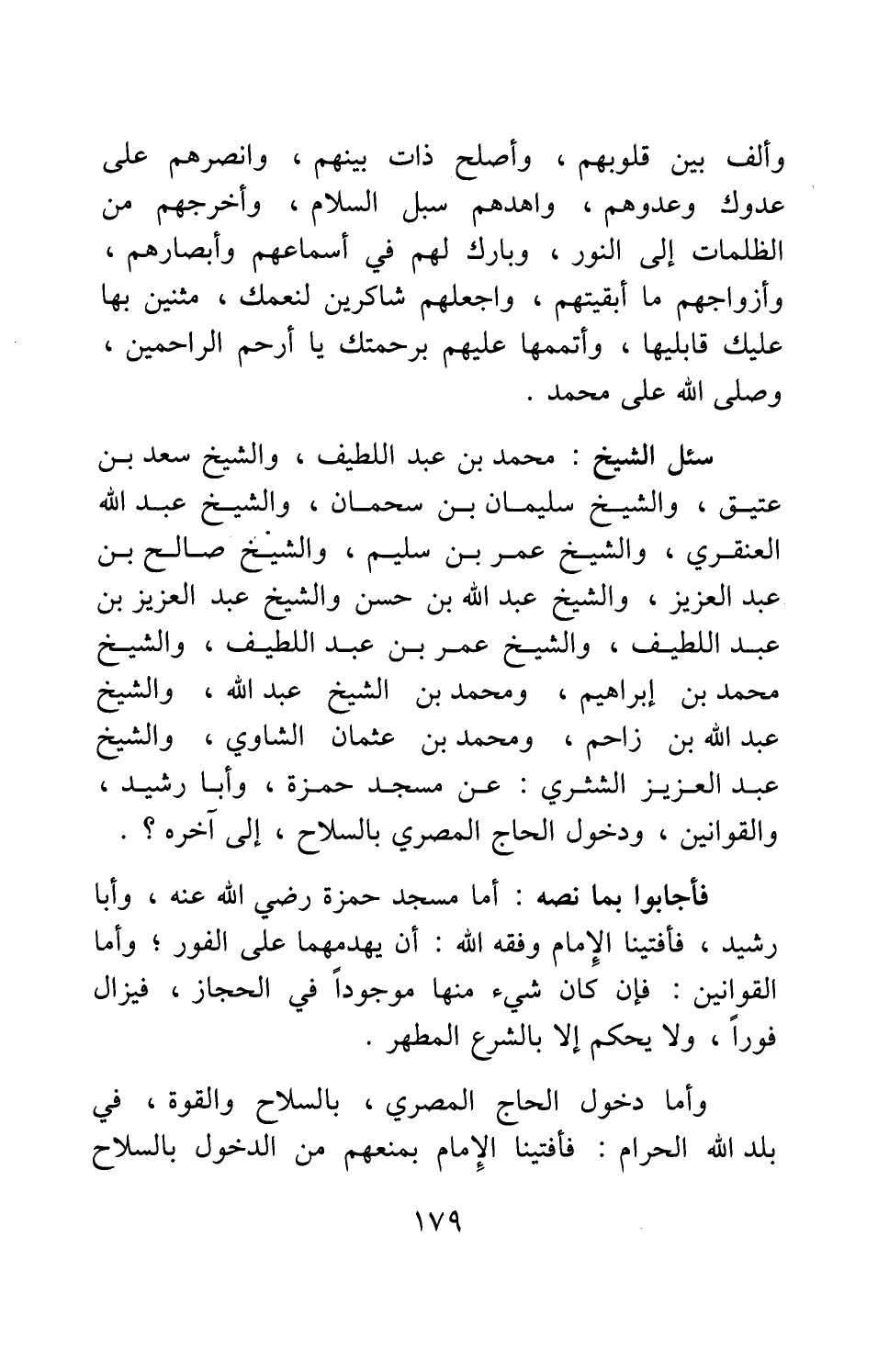 سئل الشيخ محمد بن عبد اللطيف، والشيخ سعد بن عتيق، والشيخ سليمان بن سحمان، والشيخ عبد الله العنقري، والشيخ عمر بن سليم، والشيخ صالح بن عبد العزيز، والشيخ عبد الله بن حسن والشيخ عبد العزيز بن عبد اللطيف، والشيخ عمر بن عبد اللطيف، والشيخ محمد بن إبراهيم، ومحمد بن الشيخ عبد الله، والشيخ عبد الله بن زاحم، ومحمد بن عثمان الشاوي، والشيخ عبد العزيز الشثري عن مسجد حمزة، وأبا رشيد، والقوانين، ودخول الحاج المصري بالسلاح، إلى آخره؟
