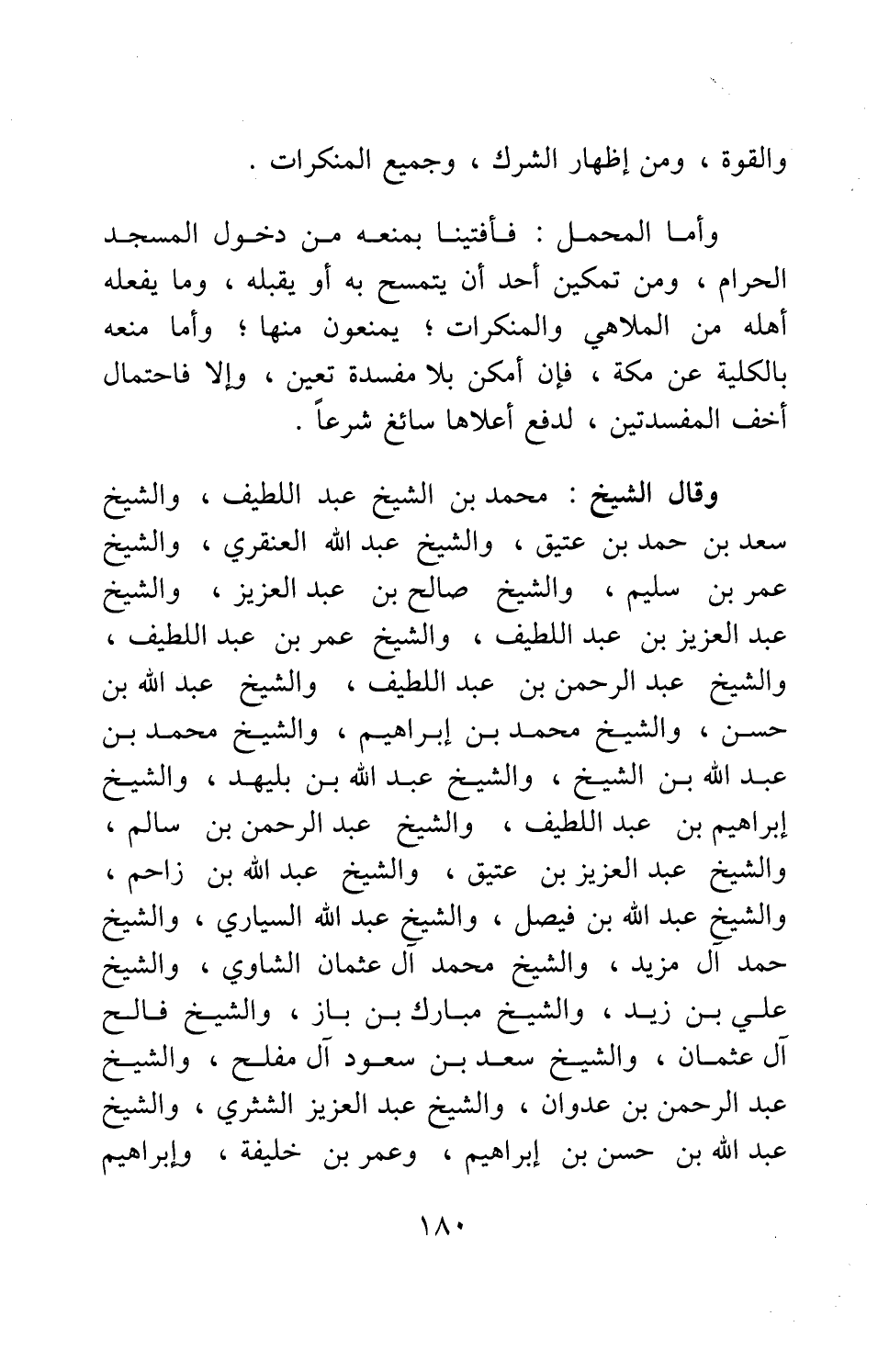 وقال الشيخ محمد بن الشيخ عبد اللطيف، والشيخ سعد بن حمد بن عتيق، والشيخ عبد الله العنقري، والشيخ عمر بن سليم، والشيخ صالح بن عبد العزيز، والشيخ عبد العزيز بن عبد اللطيف، والشيخ عمر بن عبد اللطيف، والشيخ عبد الرحمن بن عبد اللطيف، والشيخ عبد الله بن حسن، والشيخ محمد بن إبراهيم، والشيخ محمد بن عبد الله بن الشيخ، والشيخ عبد الله بن بليهد، والشيخ إبراهيم بن عبد اللطيف، والشيخ عبد الرحمن بن سالم، والشيخ عبد العزيز بن عتيق، والشيخ عبد الله بن زاحم، والشيخ عبد الله بن فيصل، والشيخ عبد الله السياري، والشيخ حمد آل مزيد، والشيخ محمد آل عثمان الشاوي، والشيخ علي بن زيد، والشيخ مبارك بن باز، والشيخ فالح آل عثمان، والشيخ سعد بن سعود آل مفلح، والشيخ عبد الرحمن بن عدوان، والشيخ عبد العزيز الشثري، والشيخ عبد الله بن حسن بن إبراهيم، وعمر بن خليفة، وإبراهيم