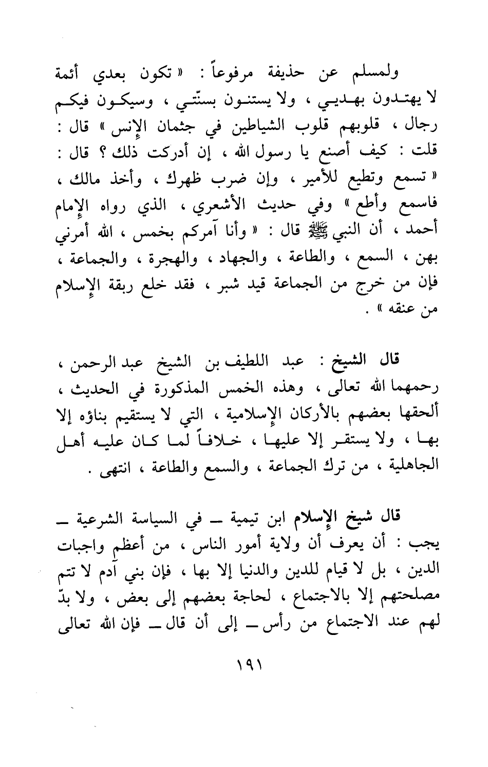 ولمسلم عن حذيفة مرفوعا: " تكون بعدي أئمة لا يهتدون بهديي، ولا يستنون بسنتي، وسيكون فيكم رجال، قلوبهم قلوب الشياطين في جثمان الإنس قال: قلت: كيف أصنع يا رسول الله، إن أدركت ذلك؟ قال: تسمع وتطيع للأمير، وإن ضرب ظهرك، وأخذ مالك، فاسمع وأطع " 1. وفي حديث الأشعري الذي رواه الإمام أحمد أنّ النبي صلى الله عليه وسلم قال: " وأنا آمركم بخمس، الله أمرني بهن، السمع، والطاعة، والجهاد، والهجرة، والجماعة؛ فإن من خرج من الجماعة قيد شبر، فقد خلع ربقة الإسلام من عنقه " 2.
