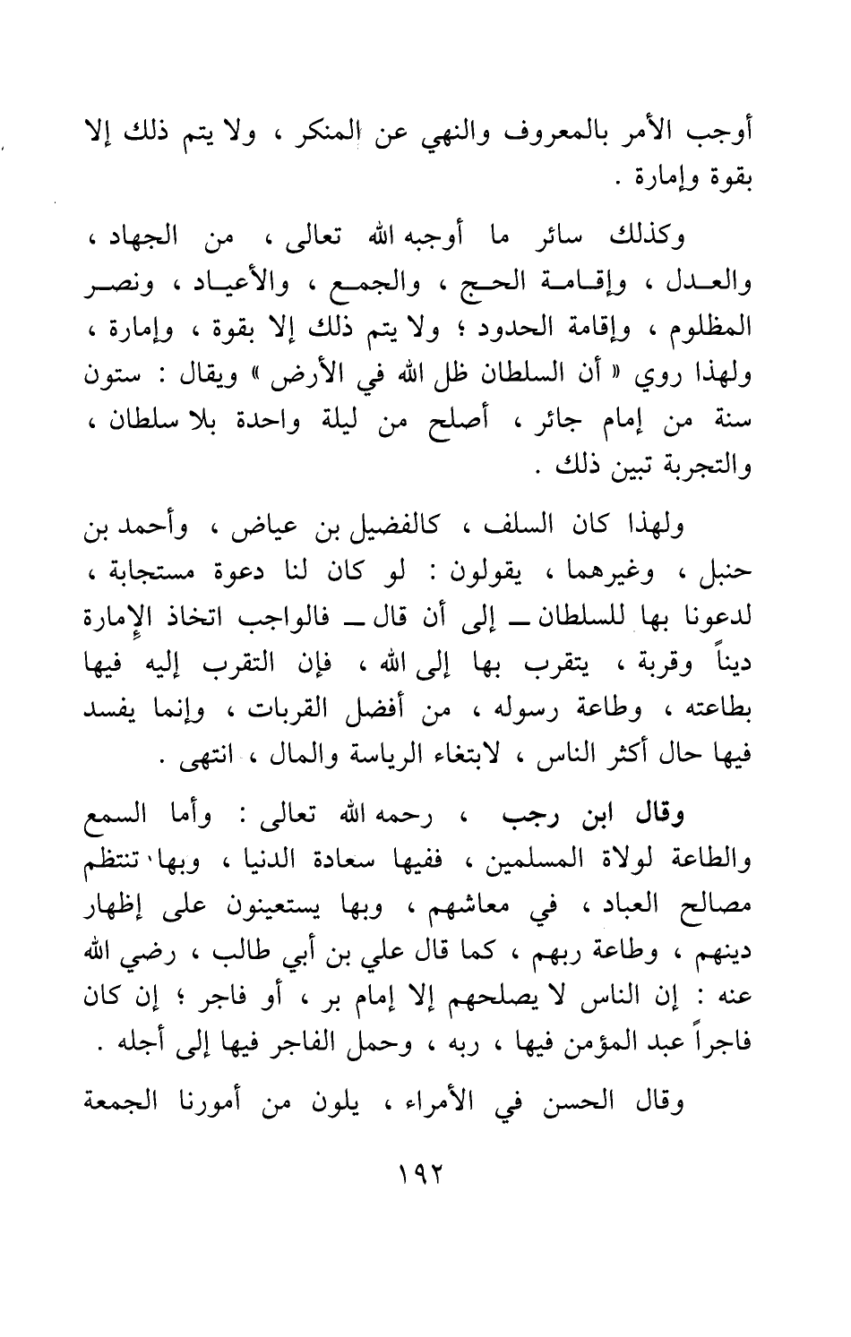 وكذلك سائر ما أوجبه الله تعالى، من الجهاد، والعدل، وإقامة الحج، والجمع، والأعياد، ونصر المظلوم، وإقامة الحدود، ولا يتم ذلك إلا بقوة، وإمارة، ولهذا روي أن السلطان ظل الله في الأرض، ويقال: ستون سنة من إمام جائر، أصلح من ليلة واحدة بلا سلطان، والتجربة تبين ذلك.
