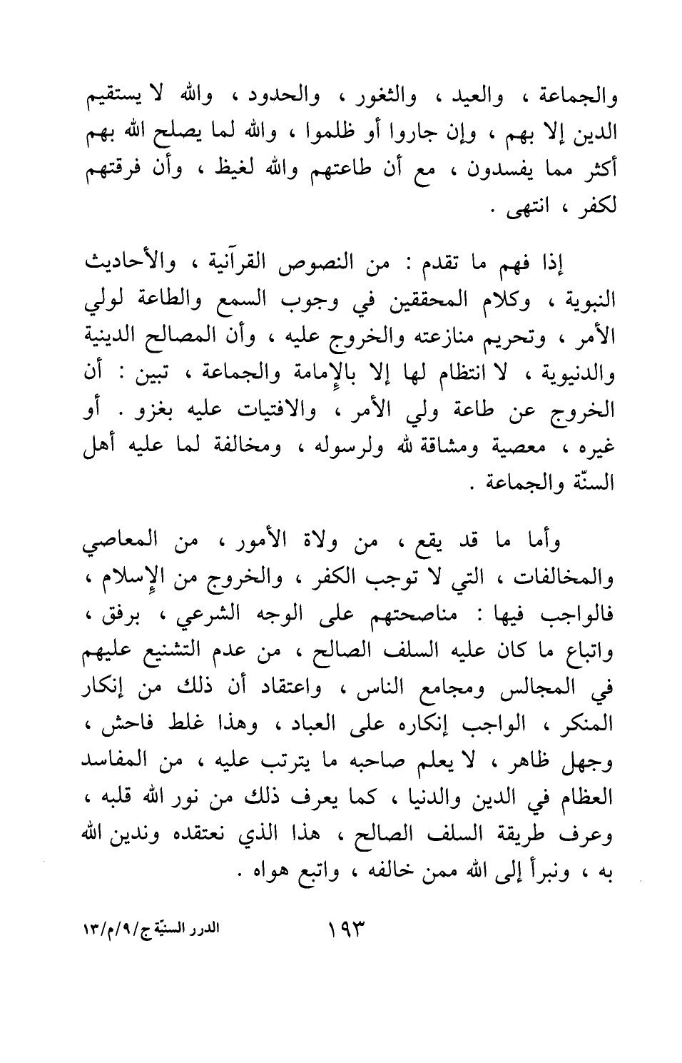 وأما ما قد يقع من ولاة الأمور، من المعاصي والمخالفات، التي لا توجب الكفر والخروج من الإسلام، فالواجب فيها: مناصحتهم على الوجه الشرعي، برفق، واتباع ما كان عليه السلف الصالح، من عدم التشنيع عليهم في المجالس ومجامع الناس، واعتقاد أن ذلك من إنكار المنكر الواجب إنكاره على العباد؛ وهذا غلط فاحش، وجهل ظاهر، لا يعلم صاحبه ما يترتب عليه، من المفاسد العظام في الدين والدنيا، كما يعرف ذلك من نور الله قلبه، وعرف طريقة السلف الصالح. هذا الذي نعتقده وندين الله به، ونبرأ إلى الله ممن خالفه، واتبع هواه.